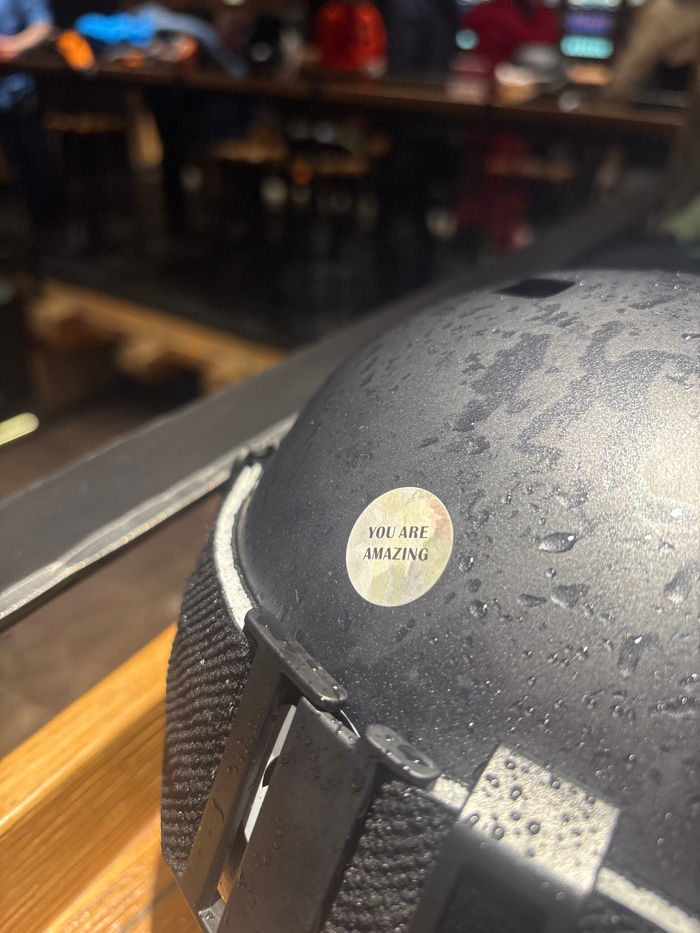 The image displays a wet, dark gray or black ski helmet positioned in the foreground, resting on a light brown wooden surface. The helmet's exterior is uniformly covered with numerous small water droplets, suggesting recent exposure to moisture. A circular, faded yellow-white sticker, approximately 4 cm in diameter, is affixed to the helmet's side, featuring the black capital text "YOU ARE AMAZING". Visible below the helmet's rim are elements of a black fabric strap with plastic buckles and a narrow edge of white interior padding. The background is significantly out of focus, revealing an indoor commercial setting consistent with a restaurant, bar, or ski lodge in Sankt Anton am Arlberg, Austria. A long, dark wooden counter or table extends horizontally across the mid-ground. Behind this counter, several blurred figures of individuals are discernible, some wearing outerwear including blue and red jackets. The lighting is ambient and somewhat dim. No specific actions or interactions are clearly visible among the background figures. | Open Wire