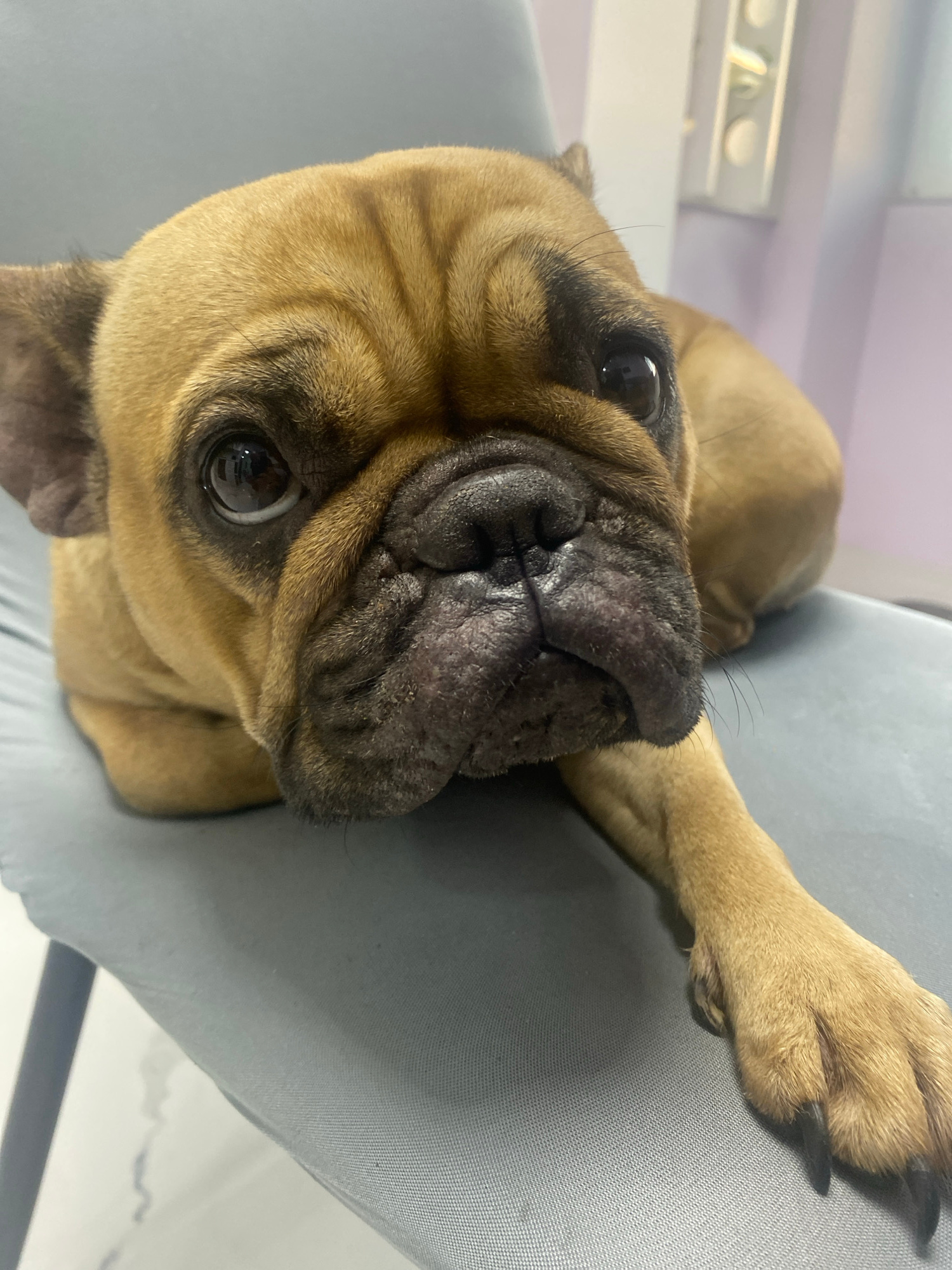The image presents a close-up, eye-level portrait of a fawn-colored French Bulldog. The dog is lying on its side on a light gray upholstered surface, which appears to be a chair or sofa. Its head is t…read more