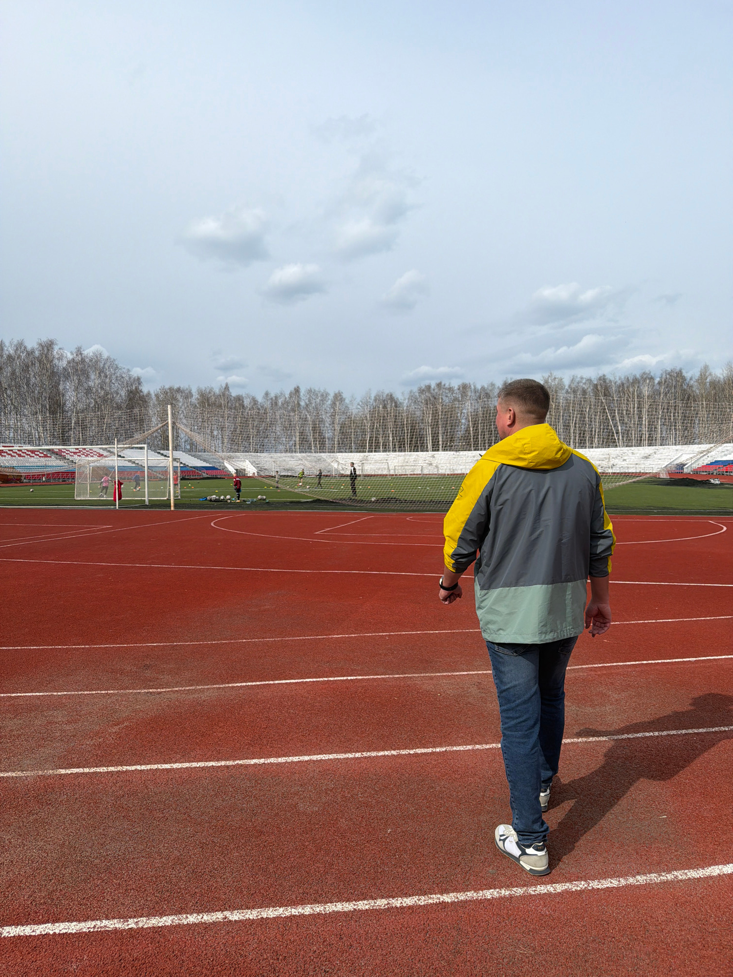 A man stands on a red running track adjacent to a soccer field in Chaikovsky, Russia. He faces away from the viewer, wearing a grey and yellow jacket, blue jeans, and white sneakers. The track is mark…read more