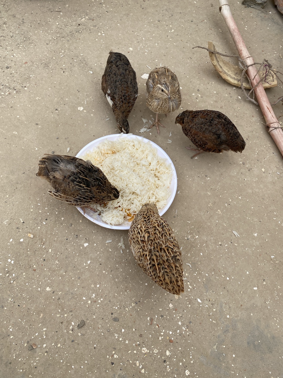 Five quail are gathered around a white plastic plate filled with cooked rice on a concrete surface. A thin, light-colored branch or stick lies to the upper right. The location is likely Kandahar, Afgh…read more