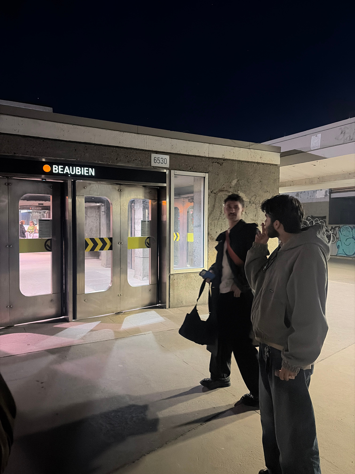 The photograph, rotated 90 degrees clockwise, captures a nighttime scene at the Beaubien Metro station in Montreal, Canada. Two young men are visible on the train platform. The man in the foreground,…read more