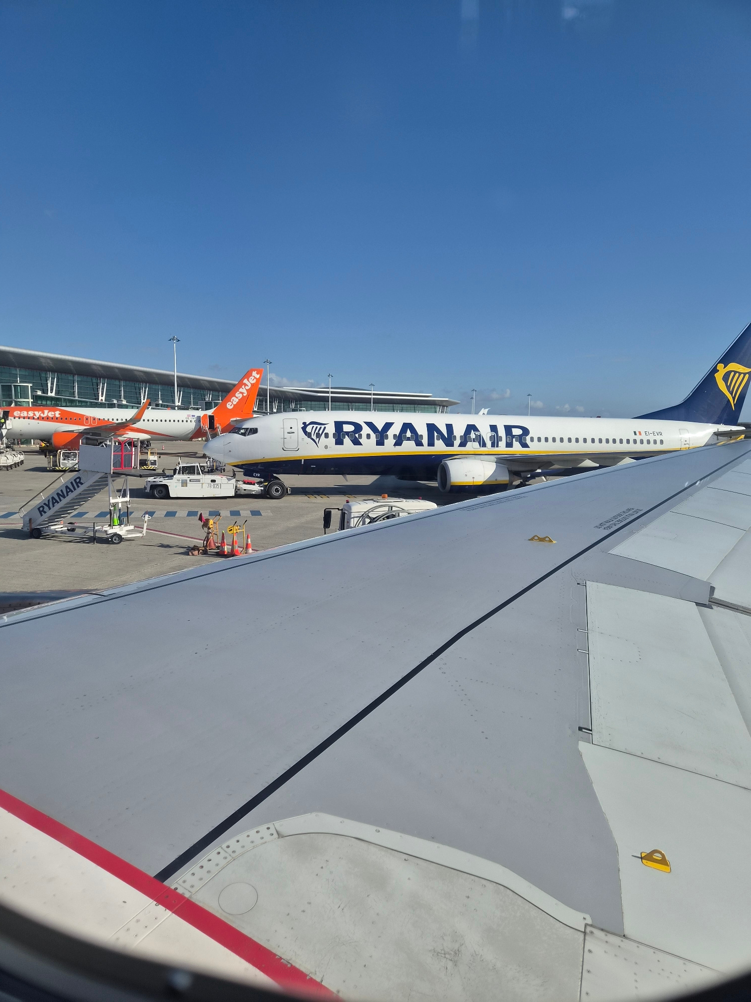 The image shows a view from an airplane window. The wing of the plane occupies the right side of the frame, with a visible red and white stripe along the edge. Beyond the wing, on the tarmac, there is…read more