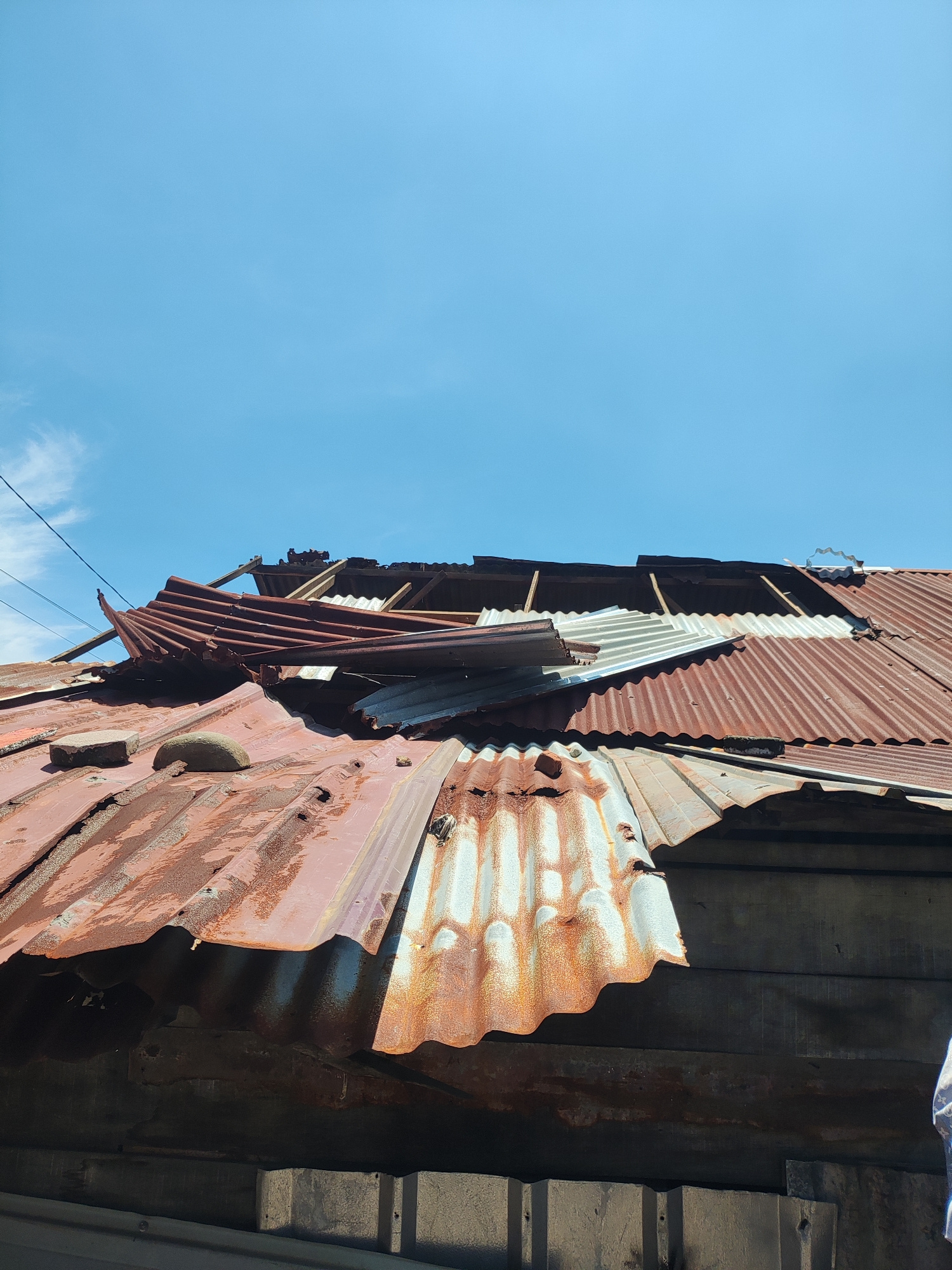The image shows a dilapidated roof of a building in Lhokseumawe, Indonesia. The roof is made of corrugated metal sheets, heavily rusted and partially collapsed. There are several large holes exposing…read more