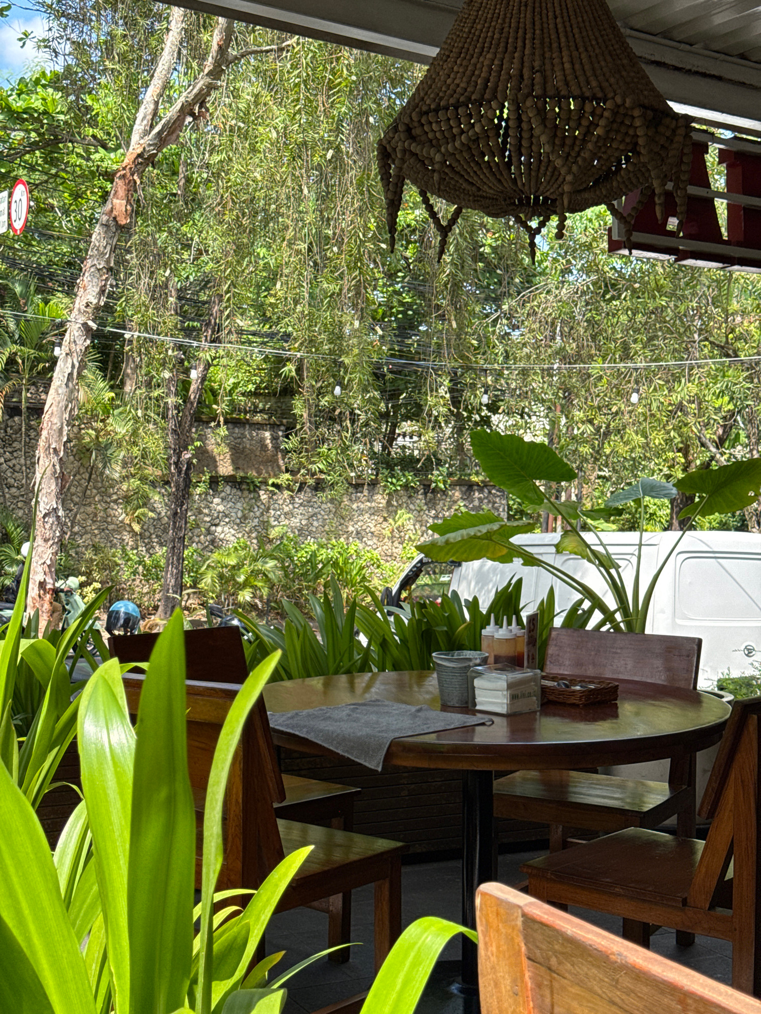 This image captures a scene at a restaurant in Kuta Selatan, Indonesia. Wooden tables and chairs are set on a patio, with lush greenery providing a backdrop. A decorative light fixture hangs overhead,…read more