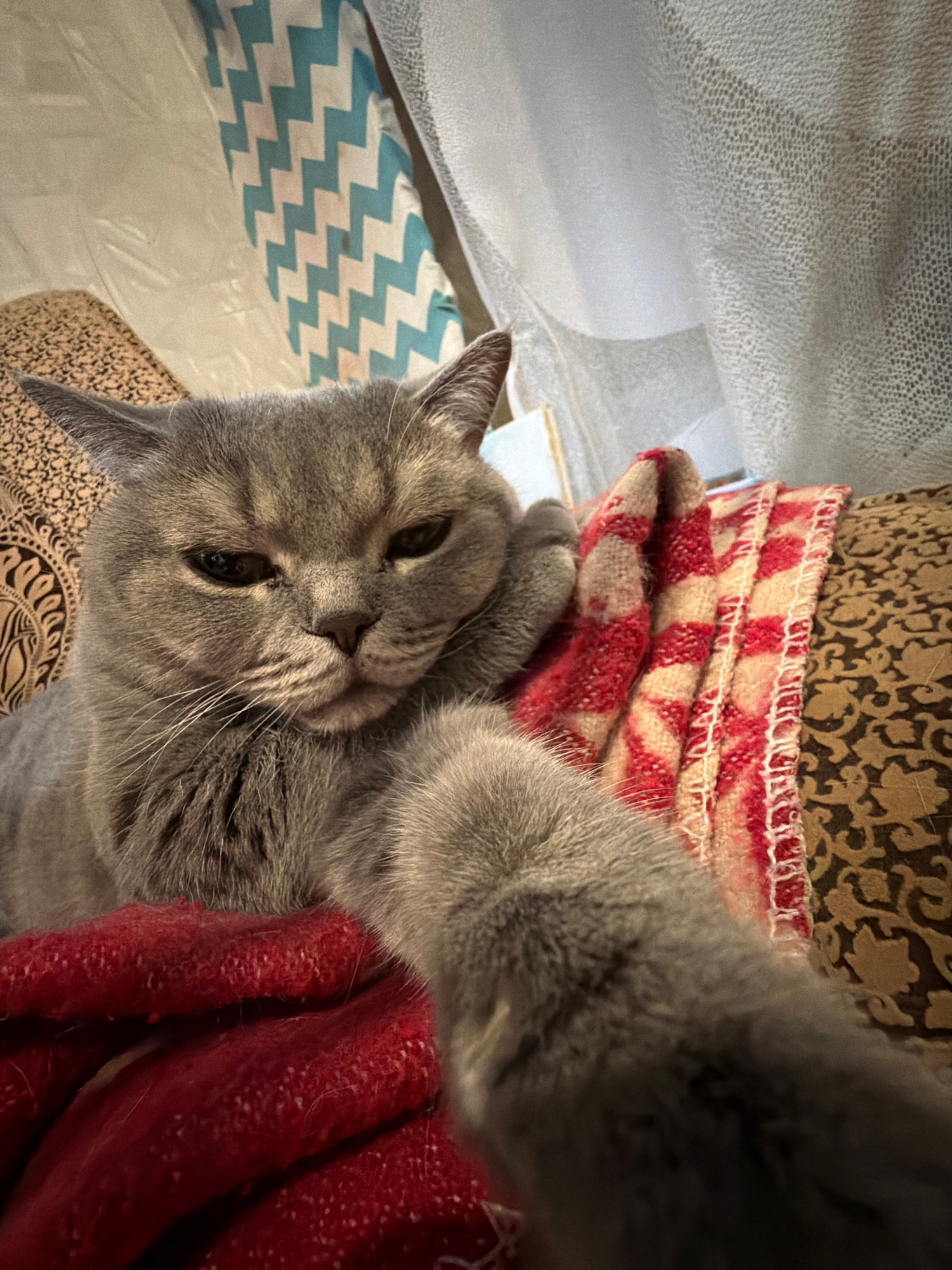 A gray British Shorthair cat is seen in a close-up, intimate portrait. The cat is resting amongst a collection of patterned textiles including red and beige striped material, paisley print material, a…read more