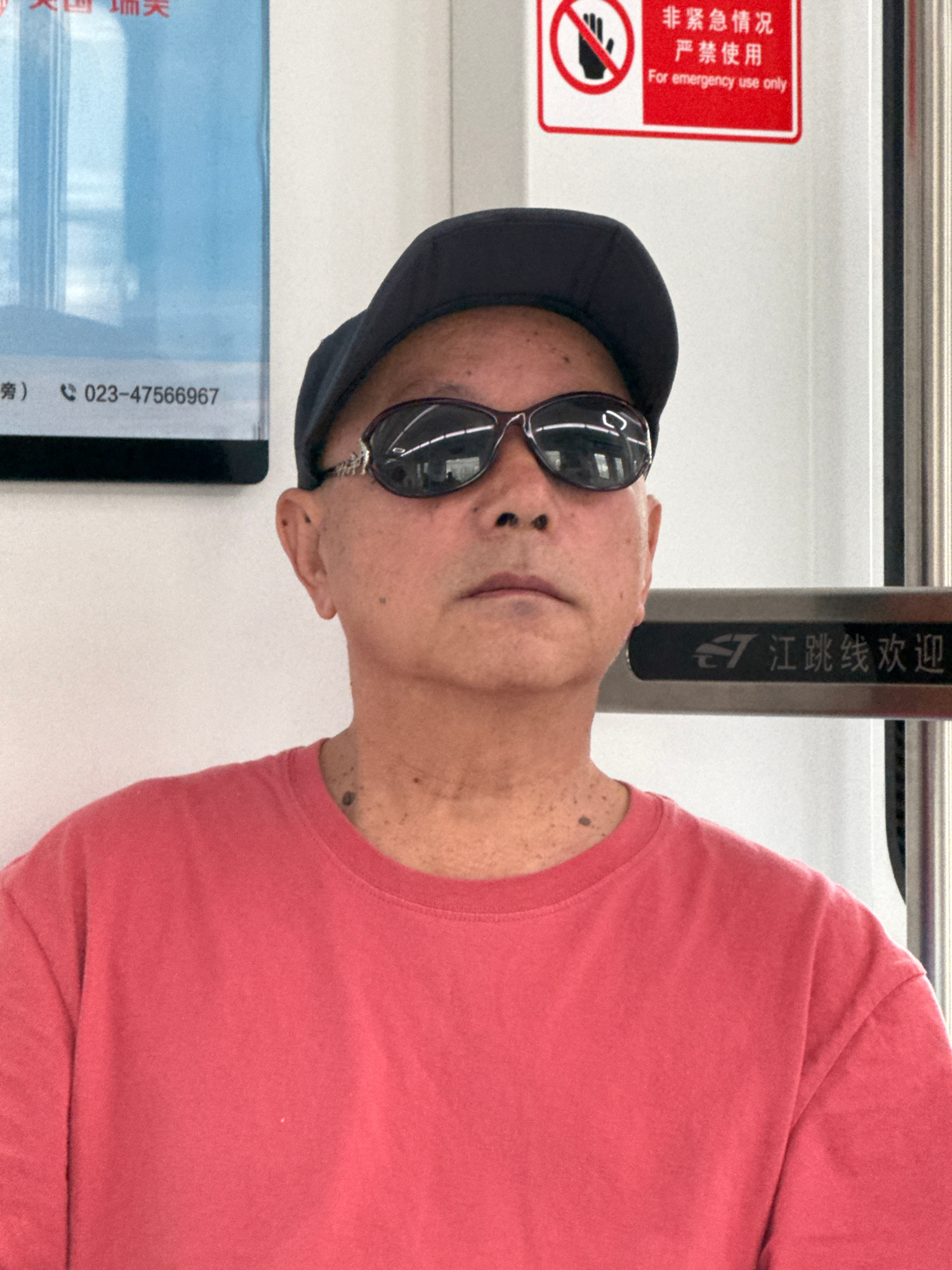 A medium shot captures a man inside what appears to be a Chinese subway or light rail car, with the image presented on its side. The man, positioned on the right side of the frame, is wearing a black…read more