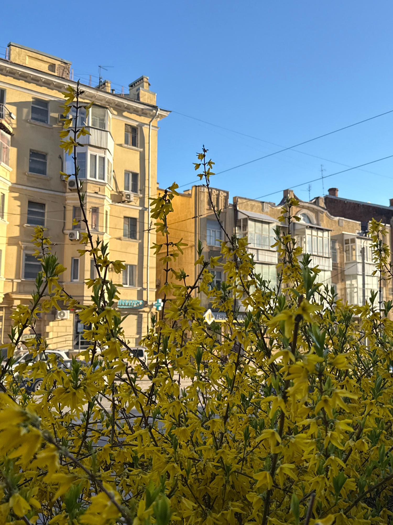 The image depicts a building with yellow flowering trees in the foreground, taken from a low angle. The building is multi-story and appears to be located in an urban area, potentially the city of Ovos…read more