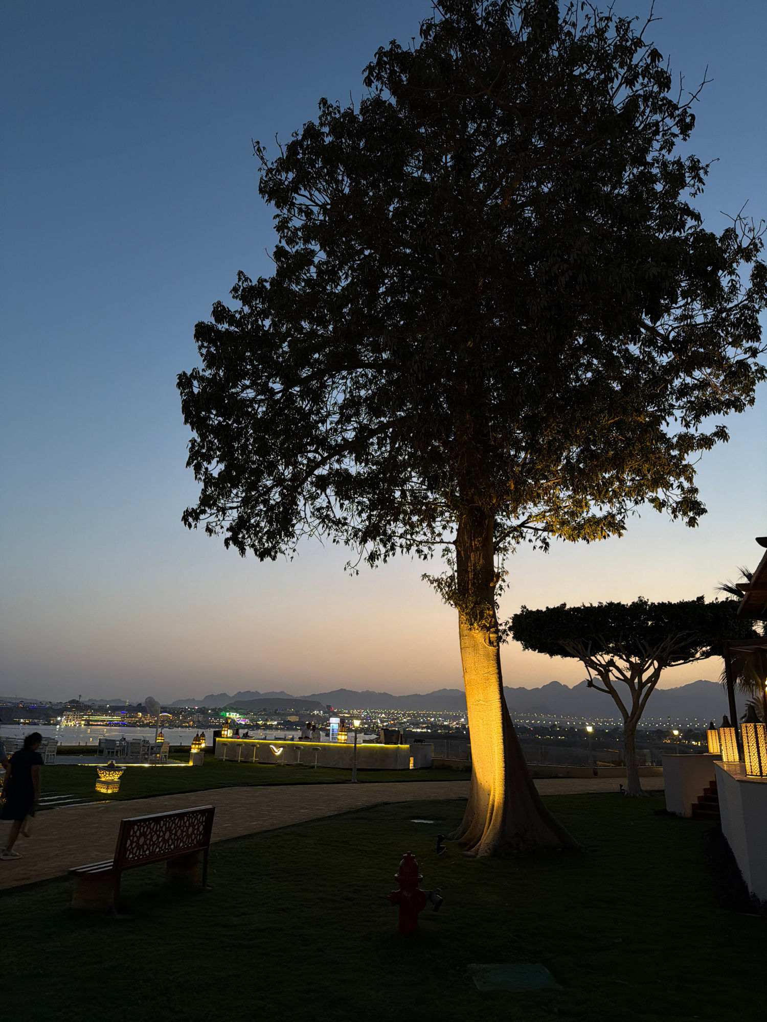An outdoor evening scene in Sharm El Sheikh, Egypt, showcases a tranquil panorama overlooking a city and mountains under a twilight sky. The image features a large, densely leafed tree dominating the…read more
