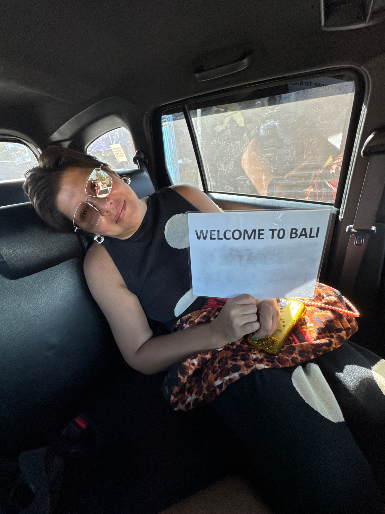 A person is seated in the back of a vehicle, holding a sign that reads "WELCOME TO BALI." The person is wearing glasses and earrings and is partially obscured by the sign. They are dressed in a black…read more