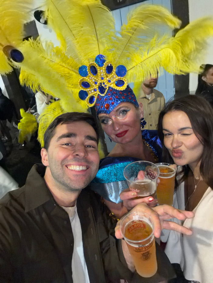 Four people pose in a rotated selfie. A woman in a blue, gem-encrusted headpiece with yellow feather adornments stands beside a man in a brown jacket. Both smile, holding up beer glasses. A woman abov…read more