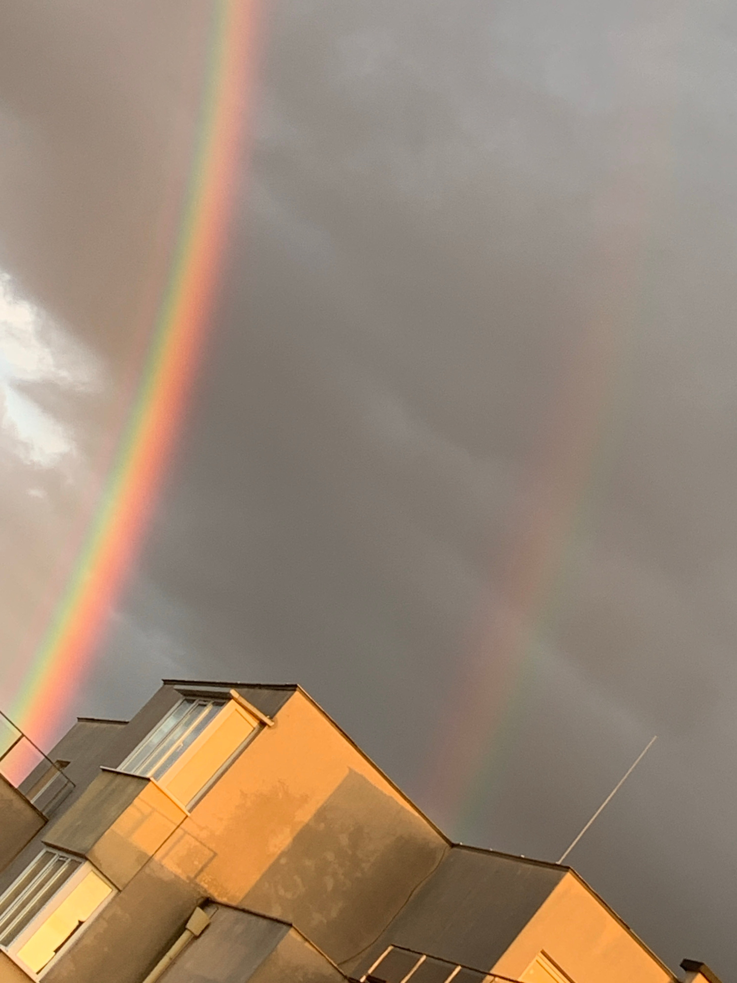 The image depicts a partial double rainbow in the sky above the city of Plovdiv, Bulgaria. The lower rainbow is more prominent, displaying a full spectrum of colors. The upper rainbow is fainter. The…read more