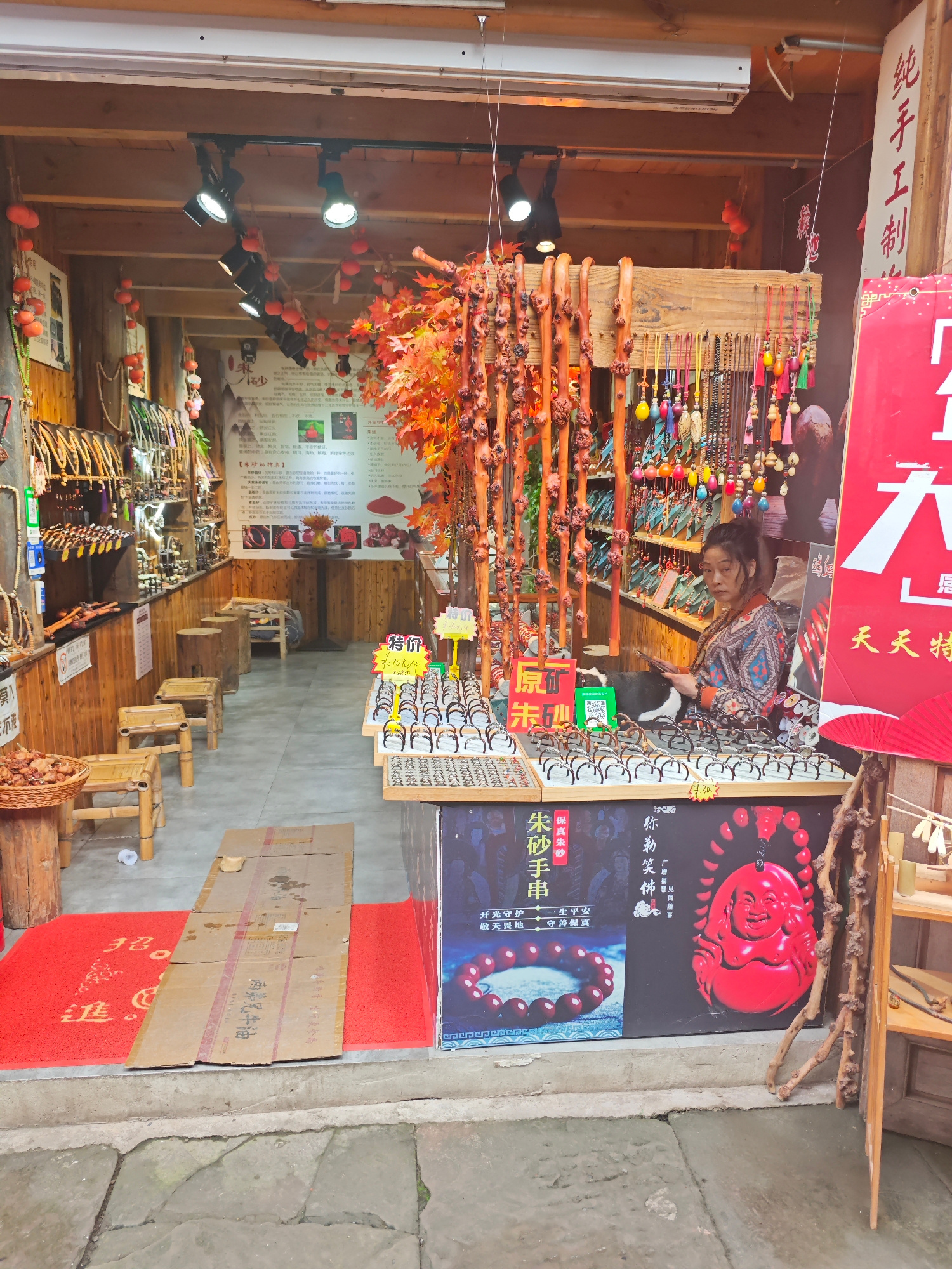 The image depicts the interior of a small shop in Shapingba District, China. A middle-aged Asian woman sits behind a counter displaying numerous pairs of eyeglasses and other small items. She is wear…read more