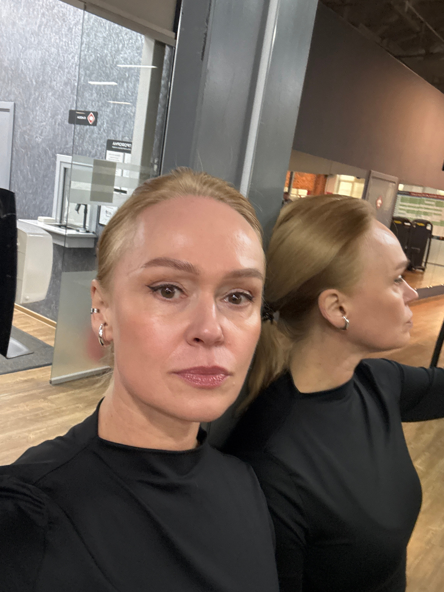 A woman in a black long-sleeved shirt is taking a selfie in what appears to be a medical office or beauty salon. Another woman is visible slightly out of focus behind her, also wearing a black top. Th…read more