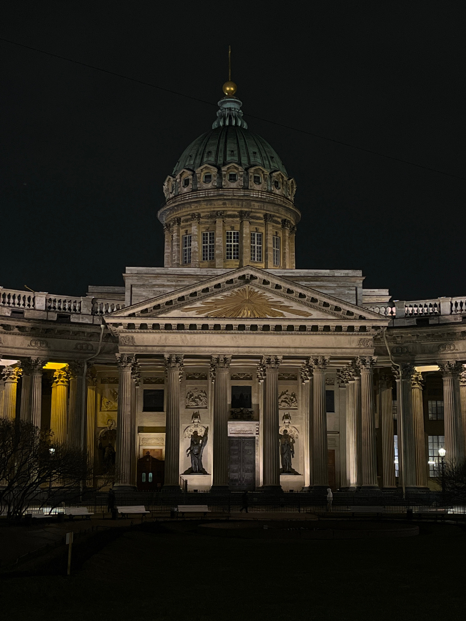 A nighttime shot of the Kazan Cathedral in Saint Petersburg, Russia, viewed at an extreme angle. The dome and facade are illuminated, showcasing architectural details such as columns and statues. Dark…read more