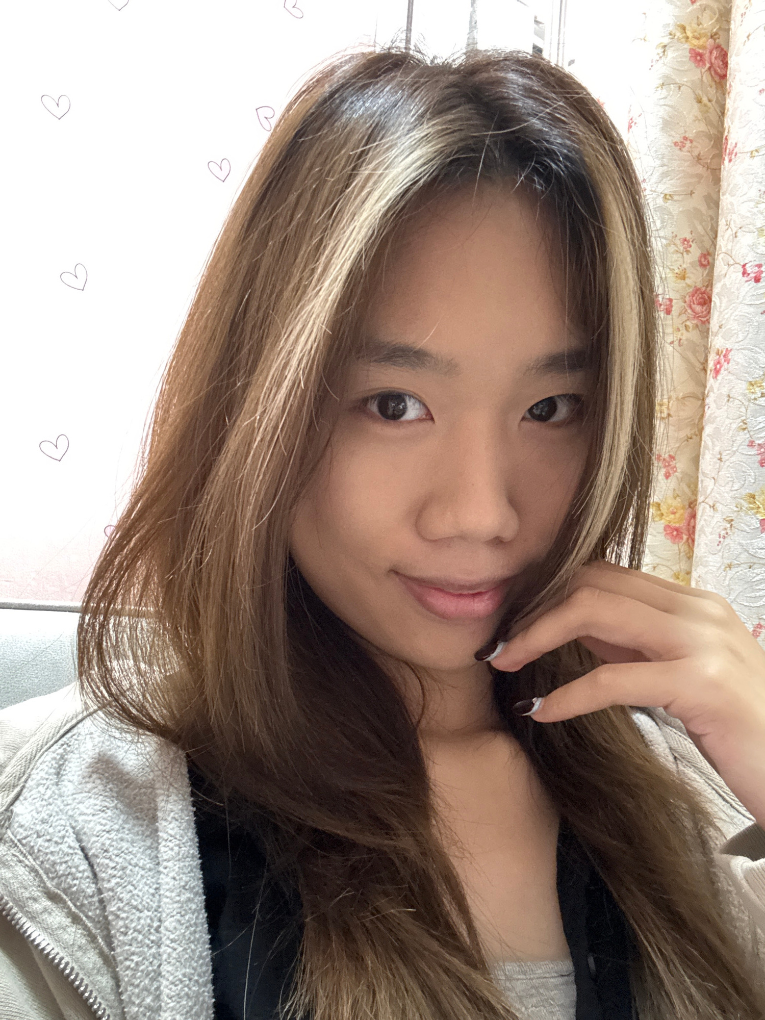 A woman is lying on a surface with a floral pattern, possibly a bed. She is facing the camera with her head tilted to the right. She has long, brown hair with lighter blonde highlights near her face.…read more
