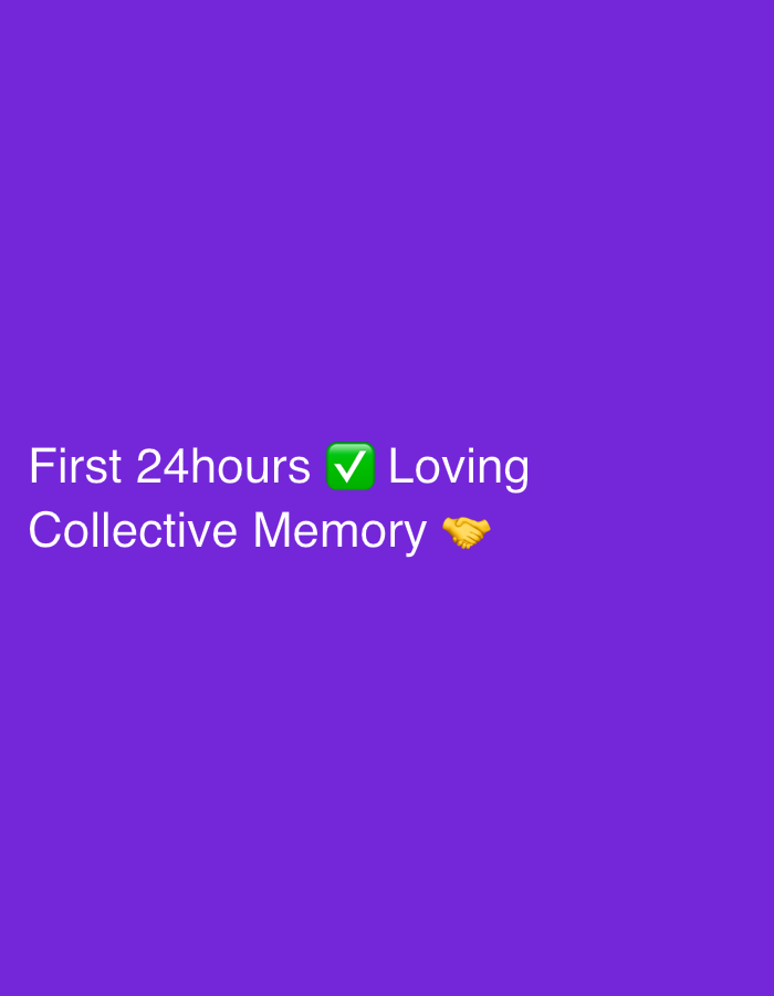 The image displays white text and emojis centered against a solid, vibrant purple background. The text reads: "First 24hours ✅ Loving Collective Memory 🤝". In the first line, "First 24hours" is foll…read more