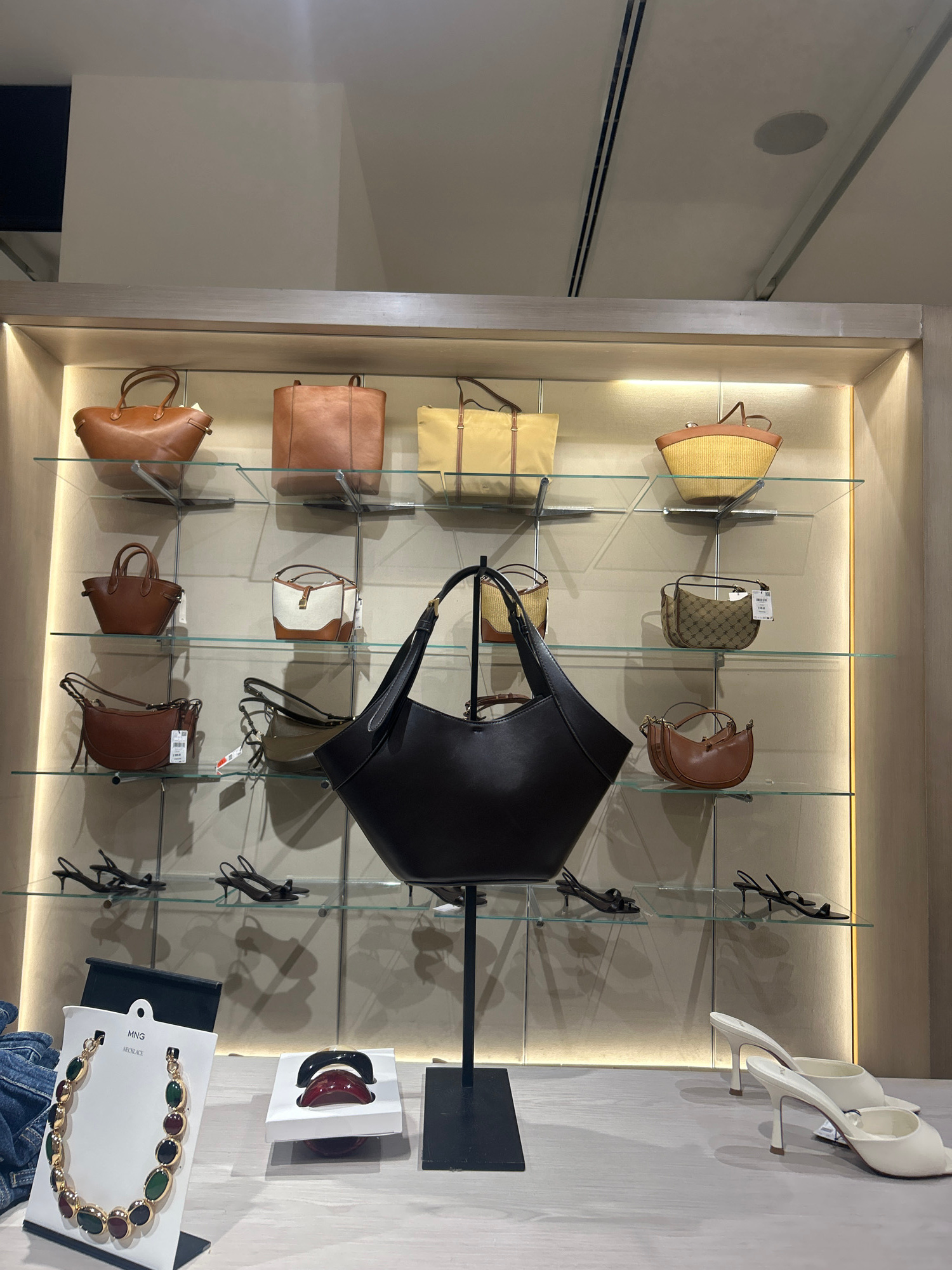 The image shows a display case in a retail setting, likely a store selling handbags and accessories. The location is unspecified, the city of San Bernardino Tlaxcalancingo, Mexico is not determined. T…read more