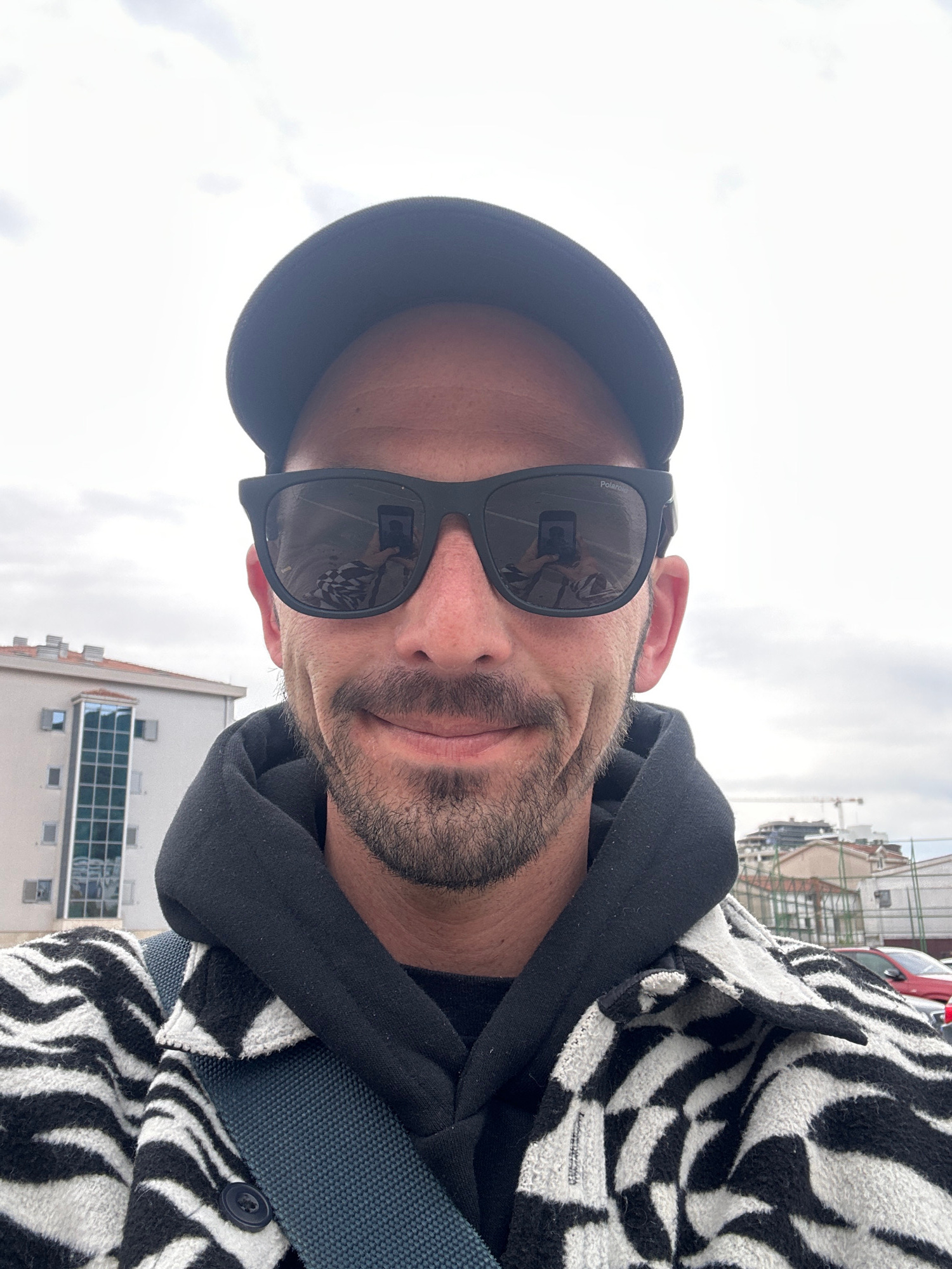 A man is taking a selfie outdoors. He is wearing a black cap, sunglasses with a reflection of the photographer holding a phone, a black hoodie, and a black and white zebra-striped jacket with a blue s…read more