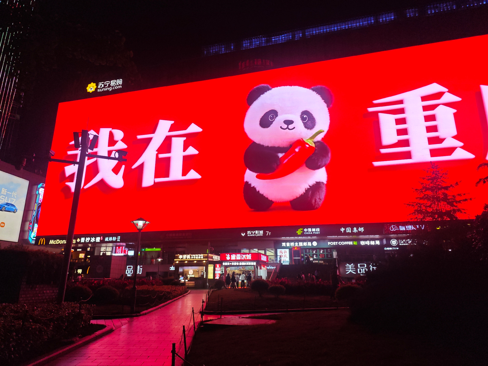 This nighttime photograph showcases a bustling commercial streetscape in Liangjiang, China, illuminated by numerous signs and a dominant LED screen. The main subject is a massive LED billboard coverin…read more