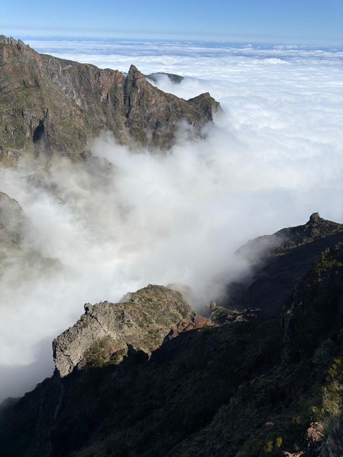 The image displays a high-altitude view of mountainous terrain in Santana, Portugal, characterized by rugged peaks and a vast sea of clouds. A clear blue sky is visible above the cloud layer at the ho…read more