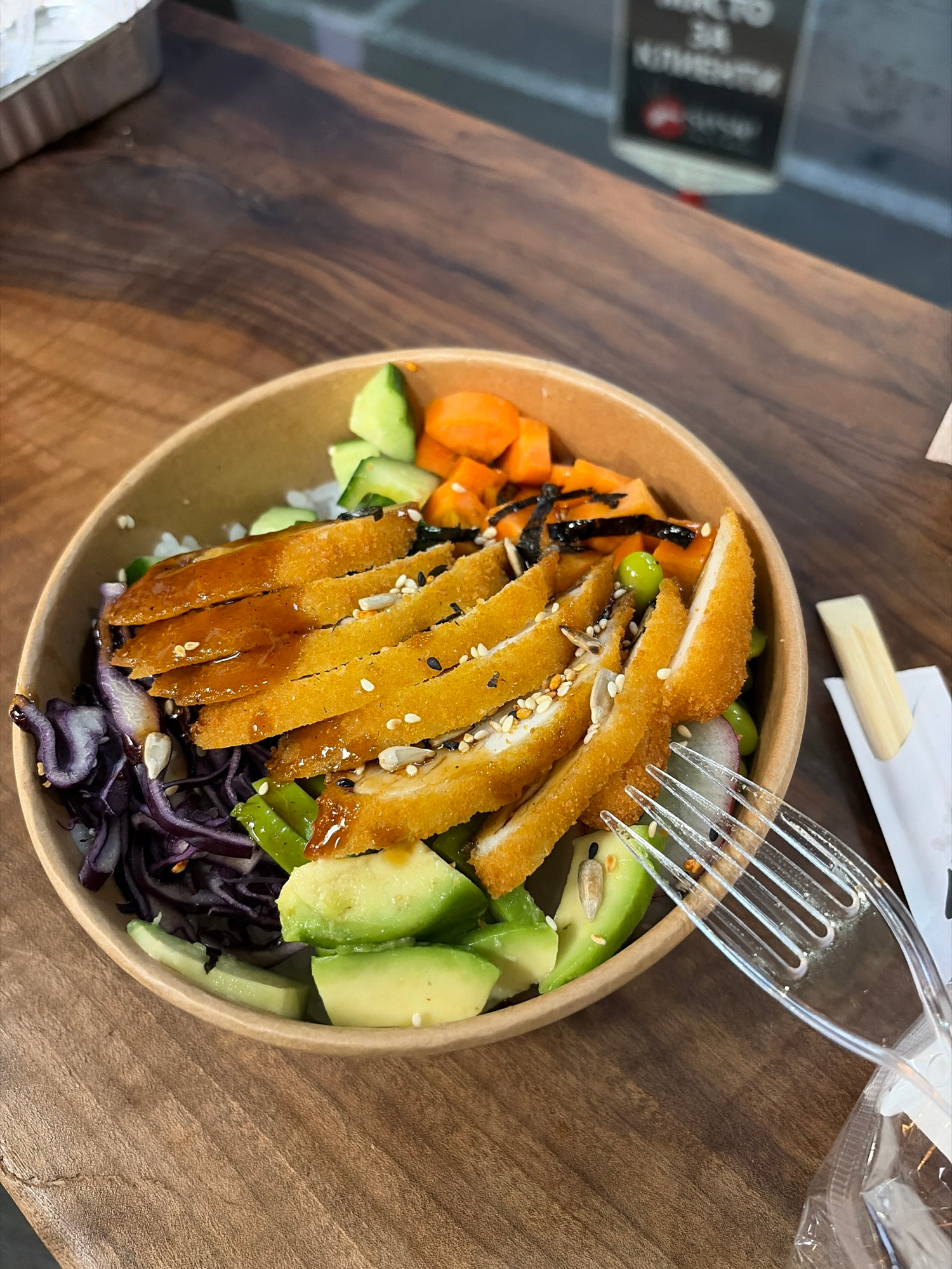 A poke bowl sits on a wooden table, viewed from an elevated angle. The bowl contains fried chicken slices with sesame seeds, rice, sliced avocado, purple cabbage, carrots, seaweed, cucumber, and edama…read more