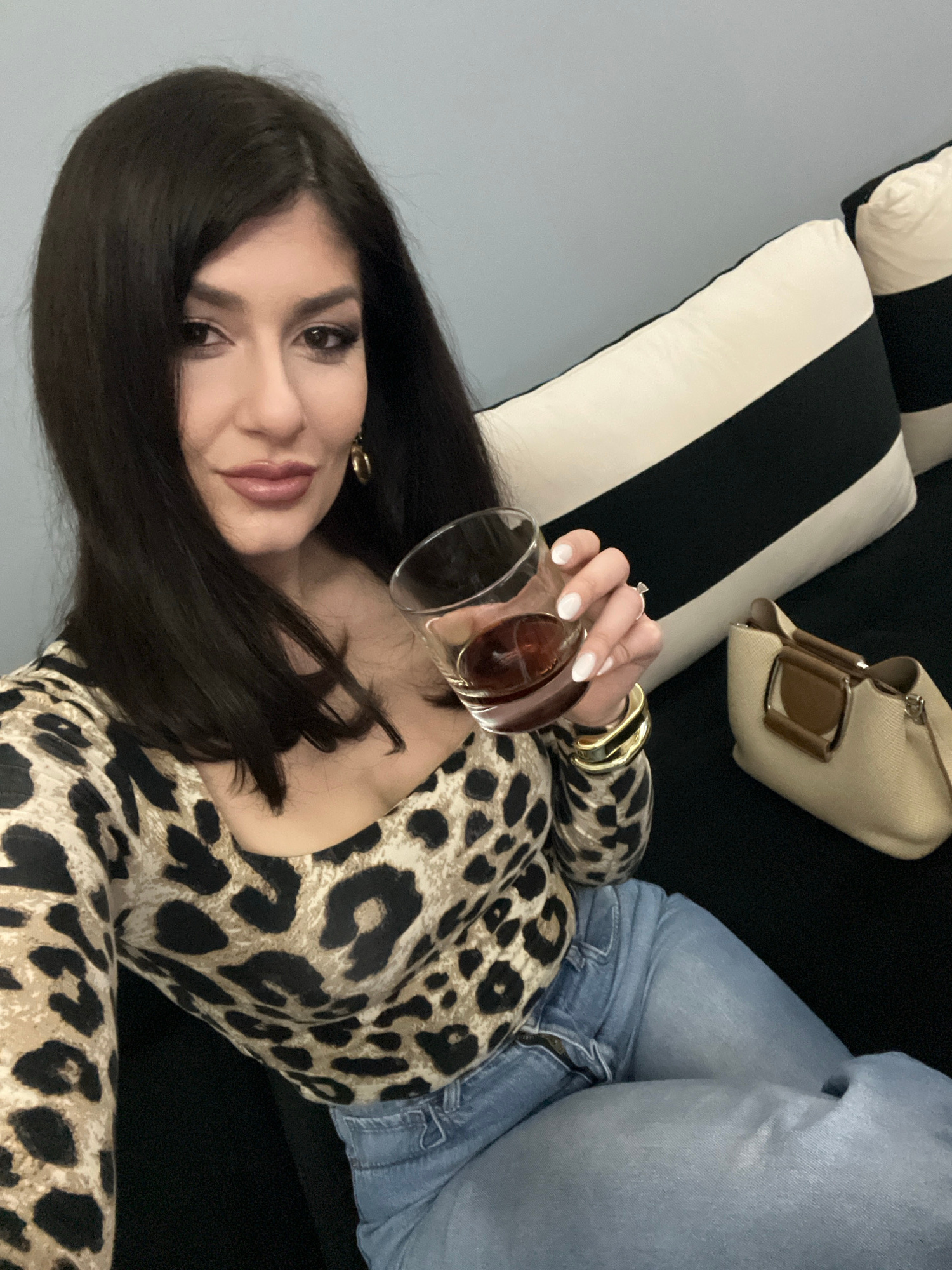 A woman with dark hair, wearing a leopard print top and jeans, is holding a glass of dark liquid. She is on a black sofa with striped cushions and a beige purse. The location cannot be determined from…read more