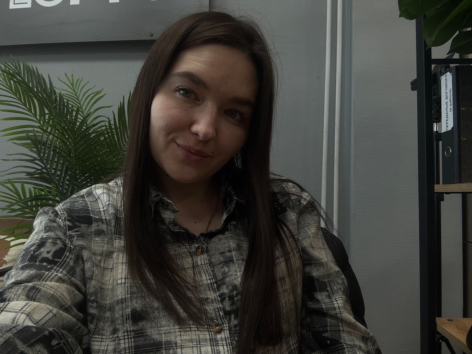 The original image displays a young woman looking directly at the camera. Her long, dark brown hair flows downwards from her head, which is positioned towards the bottom of the frame due to the image…read more