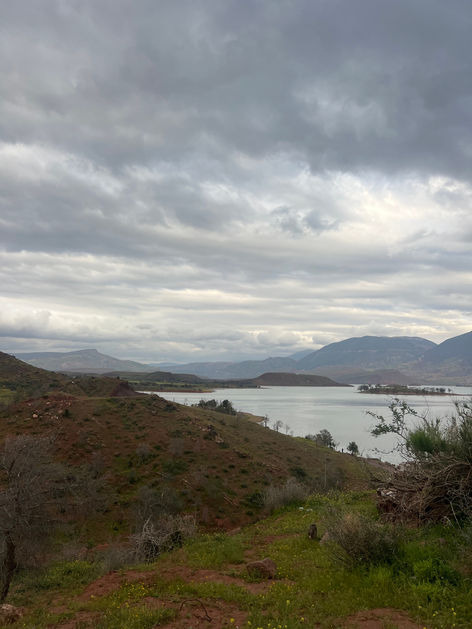 The image captures a landscape near Bin El Ouidane, Morocco. The scene presents a body of water, likely part of the Bin El Ouidane lake, bordered by hills and mountains. Overcast skies with layered cl…read more