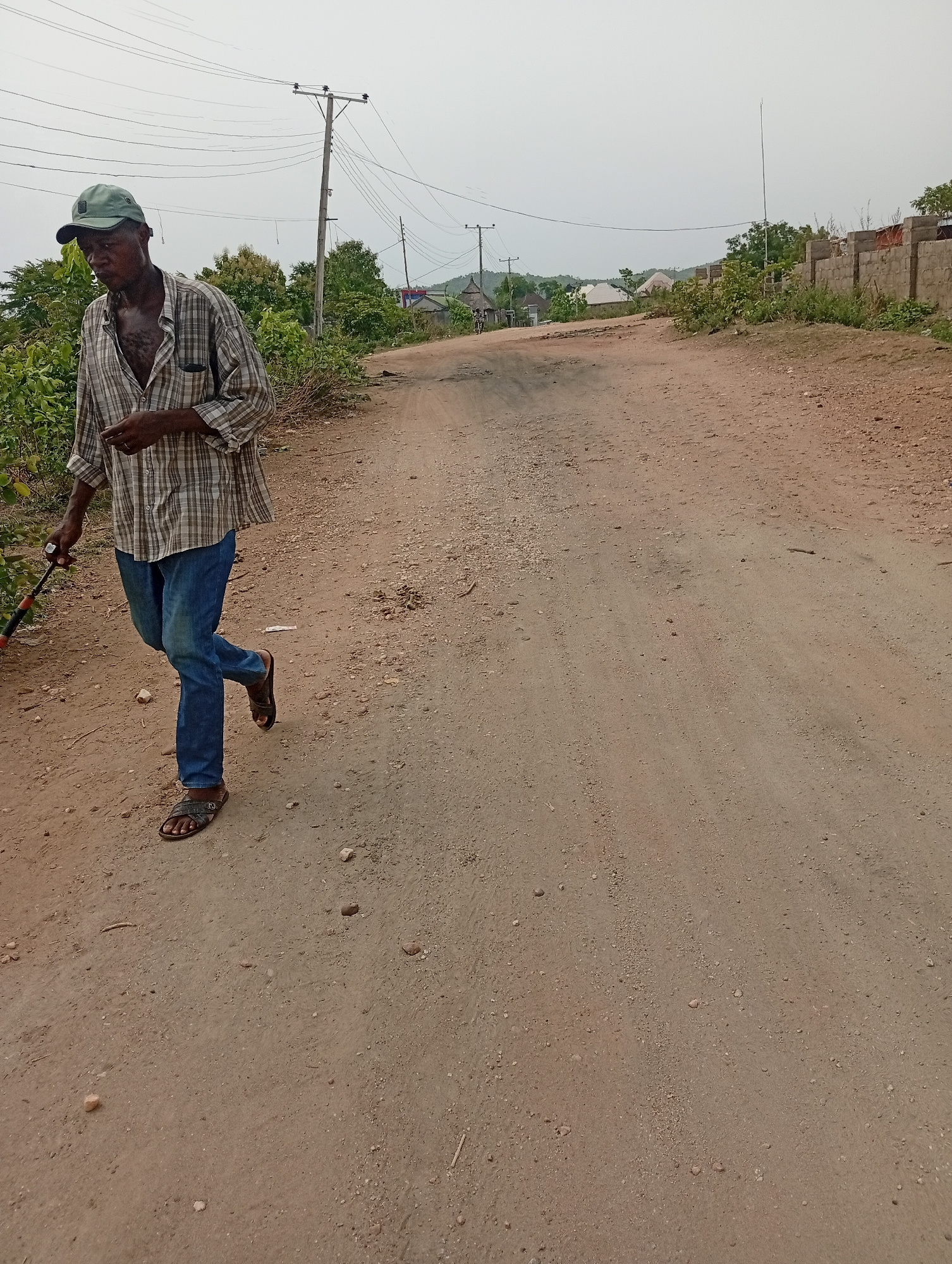 A man walks along a dirt road in Adankolo, Nigeria. The man wears a plaid shirt, blue jeans, sandals, and a green cap. He carries a stick. The road is unpaved, with vegetation on either side. Utility…read more