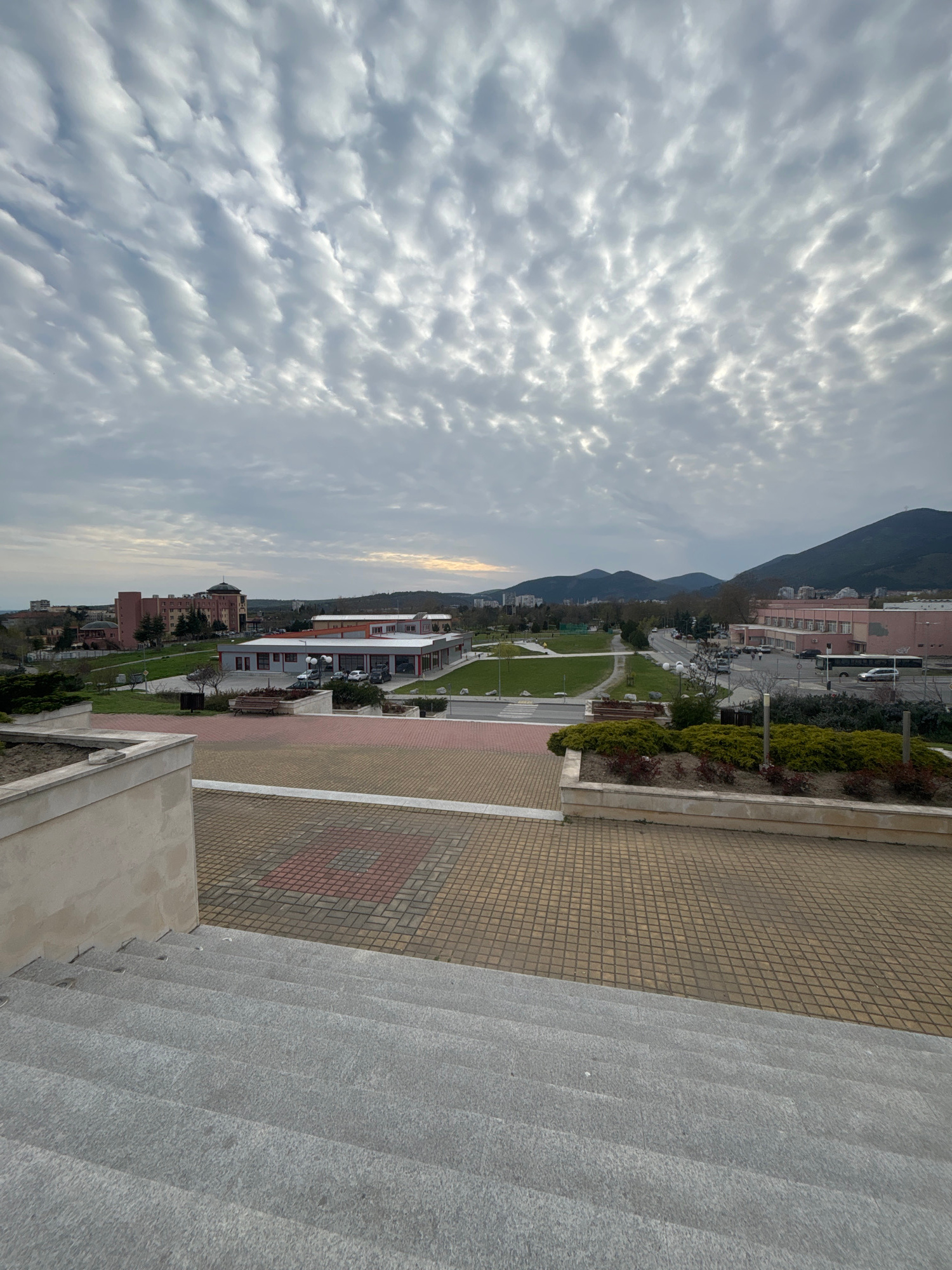The image depicts a cityscape under a sky filled with altocumulus clouds. A mountain looms in the background. In the middle ground, buildings and a park are visible. In the foreground, there are steps…read more