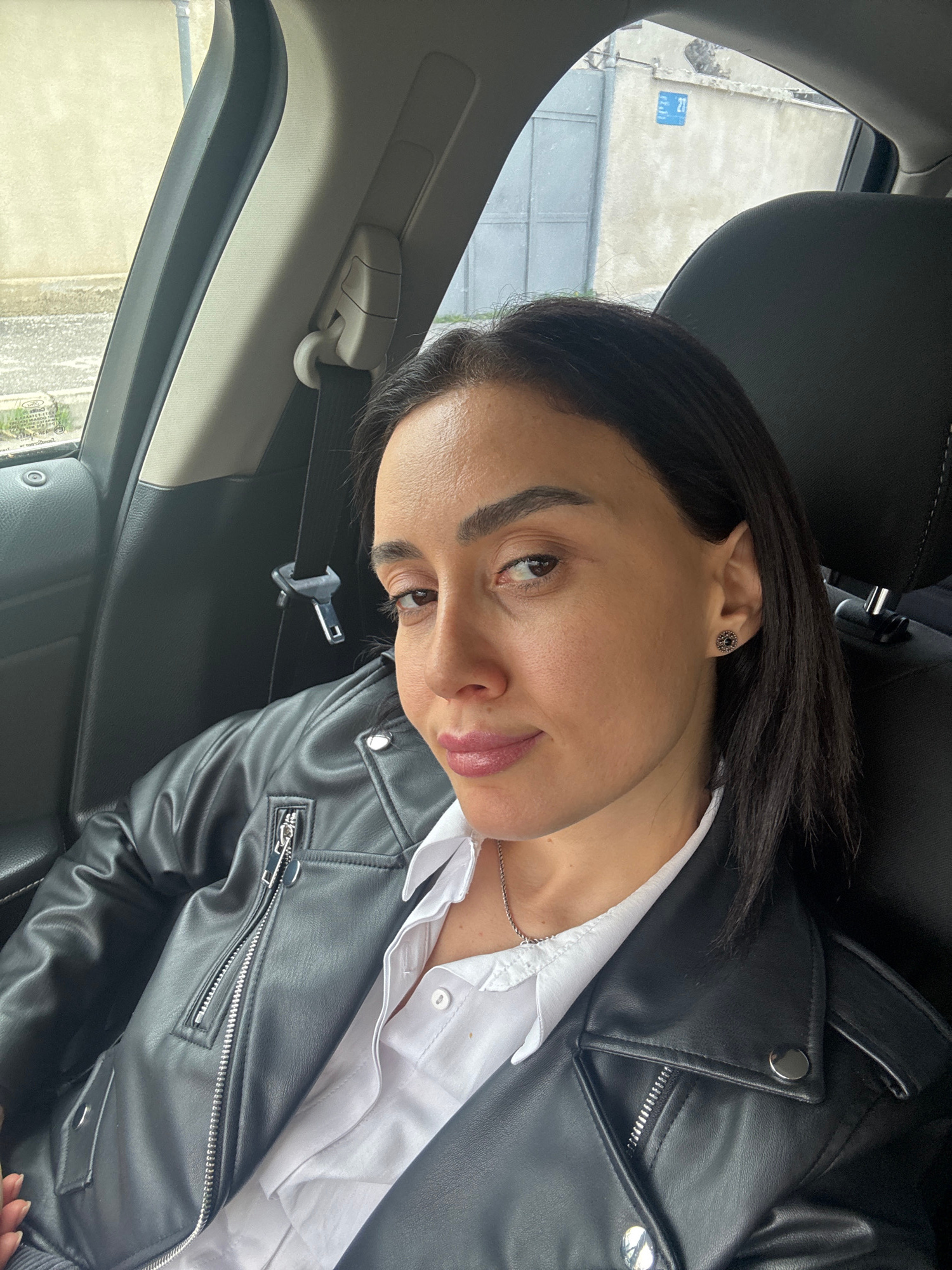 A woman is seated inside a car, wearing a black leather jacket over a white button-down shirt. The background shows a street scene through the car window, with a blue street sign visible indicating th…read more