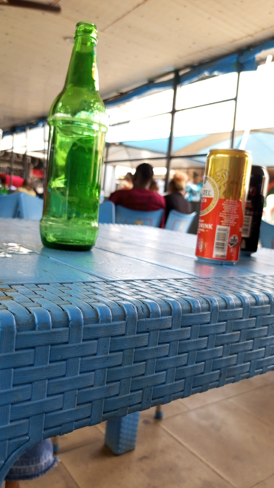 The image shows a casual outdoor scene, likely at a restaurant or bar in Sabon Tasha, Nigeria. A blue woven plastic table dominates the foreground, holding a green beer bottle, a partially visible gol…read more