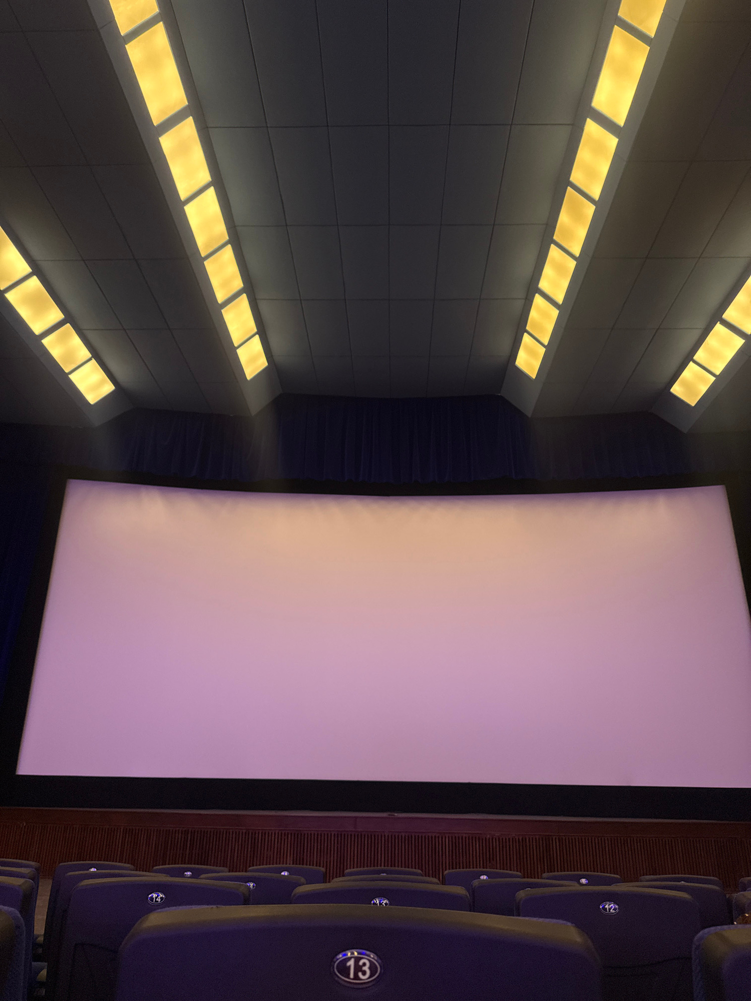The image shows the interior of a movie theater, likely in Yerevan, Armenia. A large, rectangular white screen dominates the scene. To the right of the screen, rows of dark blue or purple upholstered…read more