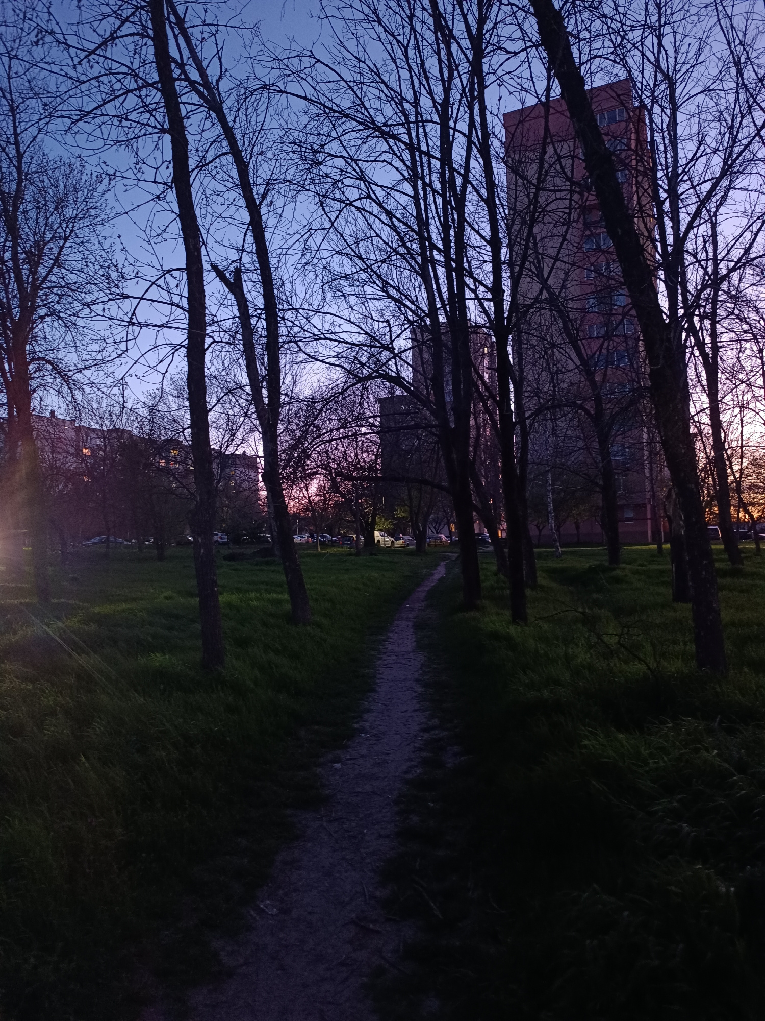 The image shows a park path in Pleven, Bulgaria, at dusk. The path, composed of packed dirt or gravel, leads through a grassy area lined with bare trees. In the background, apartment buildings are visβ¦read more
