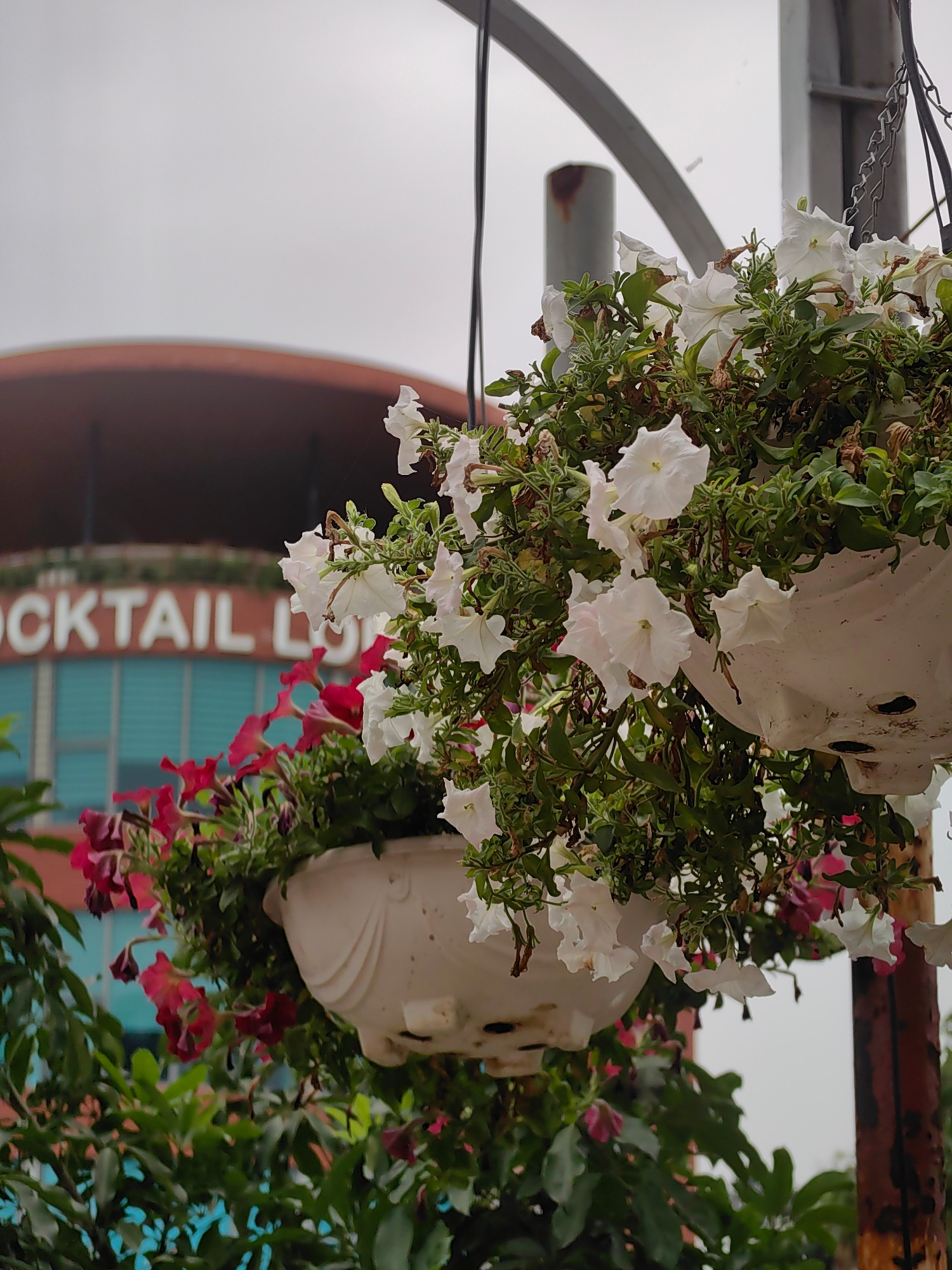 The image captures a close-up of two hanging flower pots overflowing with white and red petunias. The pots are white and shaped like a stylized fish. They are suspended from a metal arch or pole, like…read more