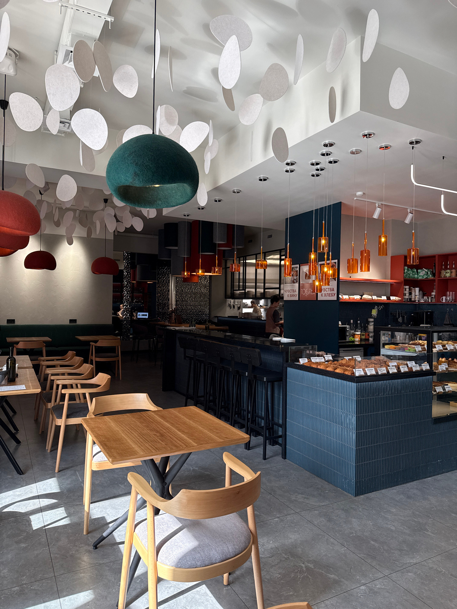 The image shows the interior of a modern cafe or restaurant. A prominent design feature is a ceiling installation consisting of numerous white, disc-shaped elements and a large, green, donut-shaped object. The restaurant has a counter with a display of food items, likely baked goods or pastries. Tables and chairs are arranged for customers. The lighting is a combination of recessed ceiling lights and hanging fixtures with warm-toned bulbs. There is a mix of seating options including wooden chairs with grey cushions. In the background, there are shelves with various items, possibly ingredients or merchandise. The floor is tiled in a neutral color. Based on other images from a search engine the image is from the FORNO cafe located in Krasnoyarsk, Russia. | Open Wire