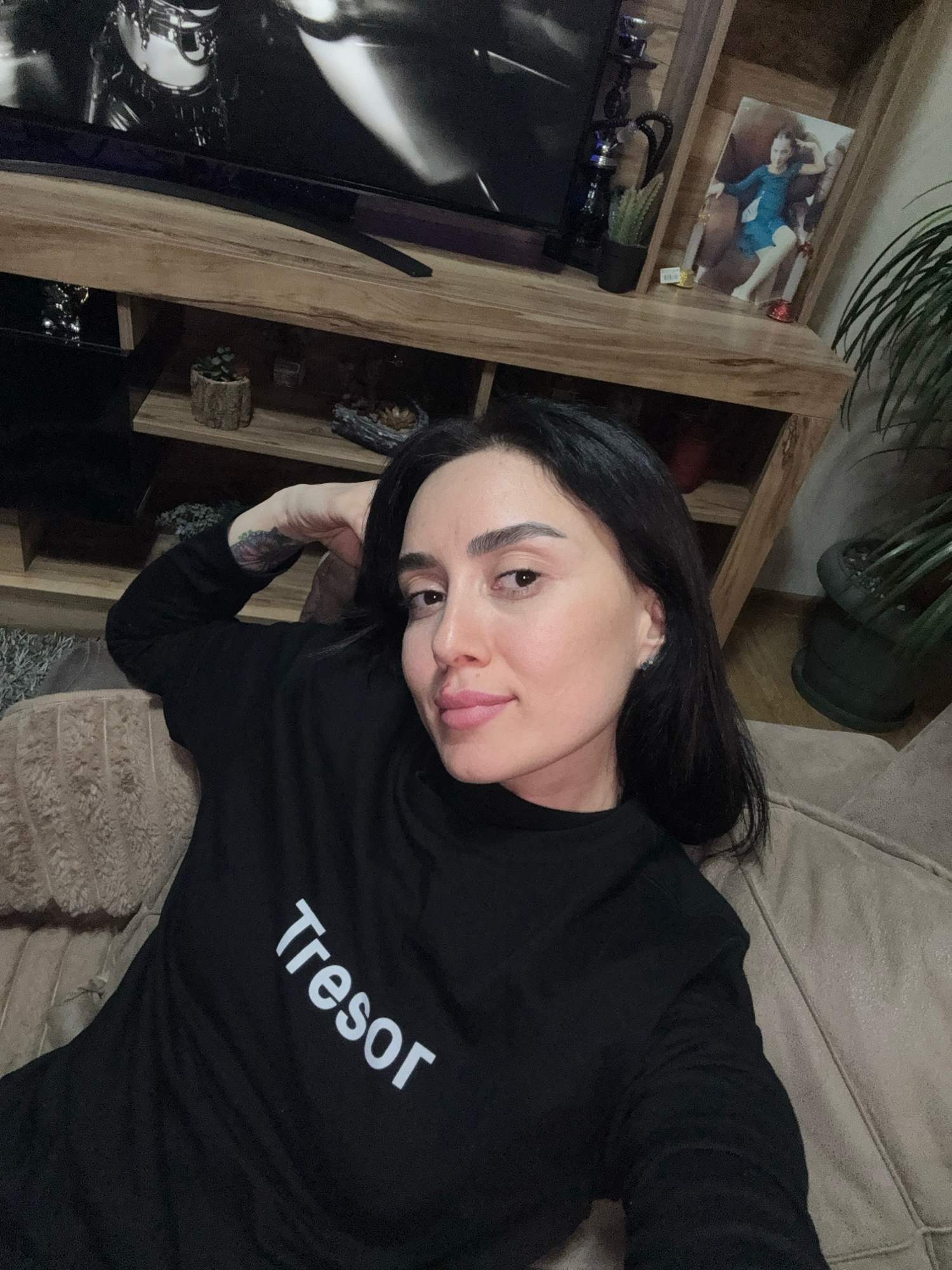 A woman is lying on a light beige sofa. She is wearing a black long-sleeved shirt with the word "Tressor" printed in white on the front. She has dark hair and fair skin, with her head resting on her h…read more