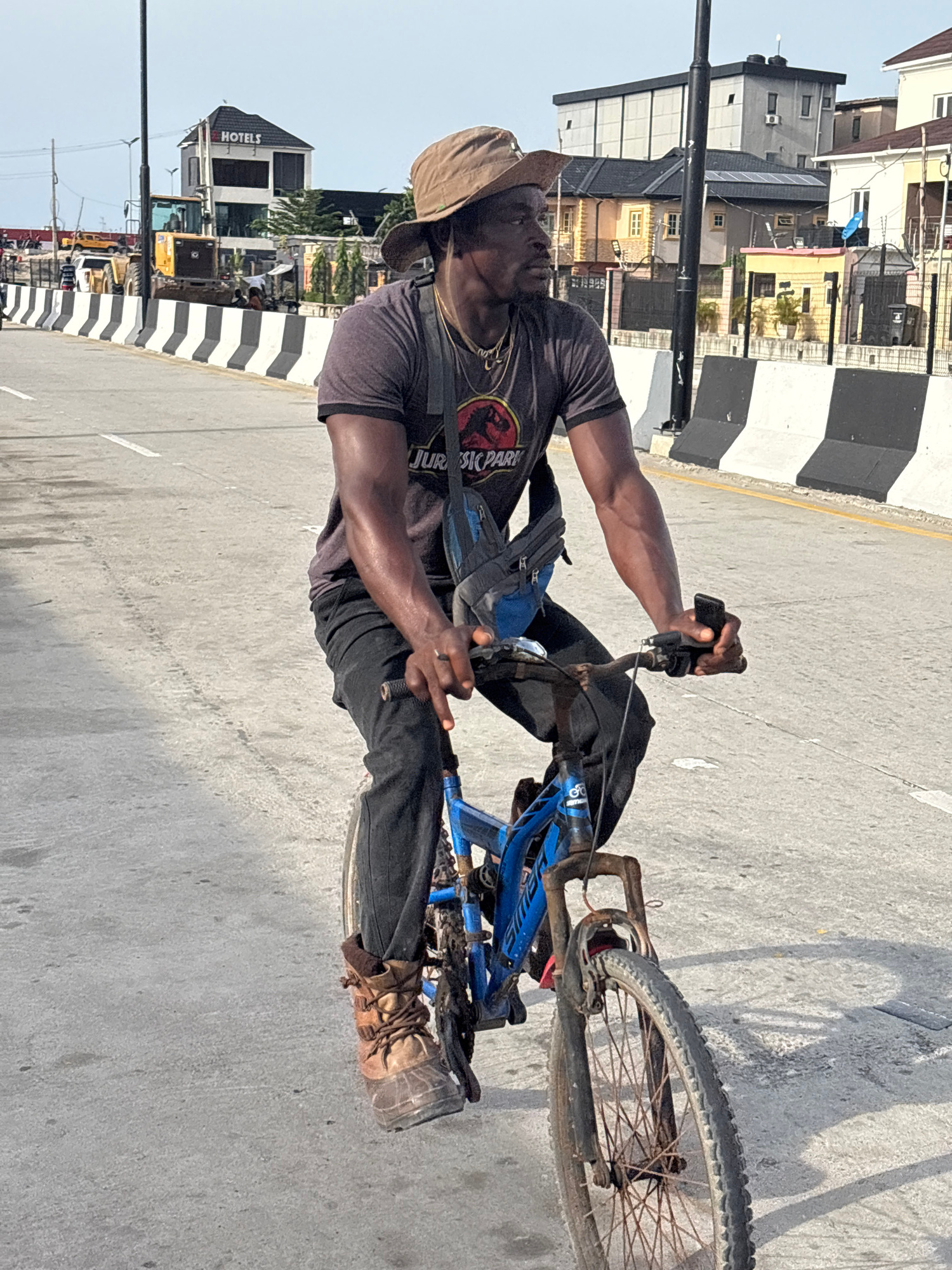 A man rides a blue bicycle along a concrete road in Igboefon, Nigeria. The man wears a khaki hat, a dark Jurassic Park t-shirt, dark pants, and brown boots. He also has a bag slung across his shoulderβ¦read more