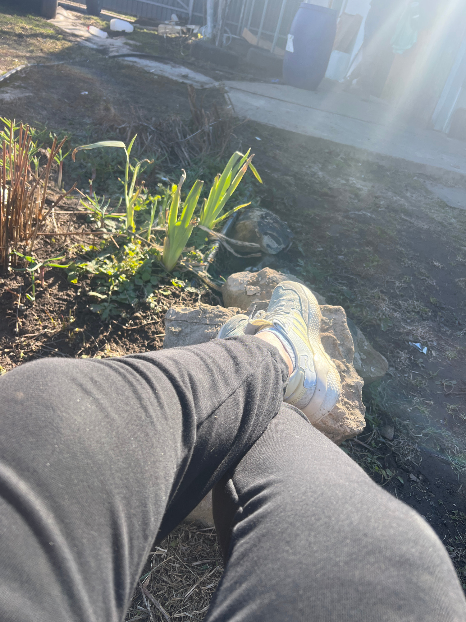 The image shows a person wearing black pants and a white and light blue sneaker, resting their foot on a light-colored rock in an outdoor environment. The ground around the rock is covered in dirt, gr…read more