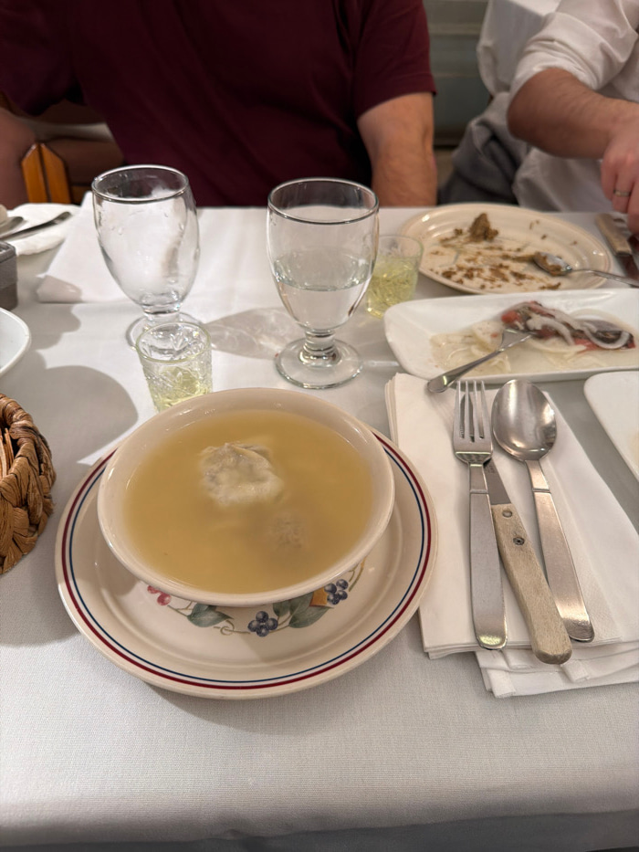 A dining table setting features a bowl of soup with a single dumpling on a decorative plate. Adjacent are a fork, knife, and spoon atop a white napkin. Empty wine glasses and plates, one with remnantsβ¦read more