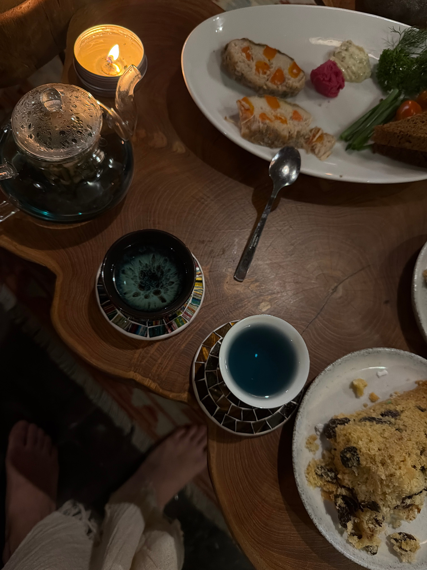 The image depicts a wooden table set with various items. A white plate holds appetizers including bread, spreads, and vegetables. Another white plate contains a slice of cake with raisins. Two cups, o…read more