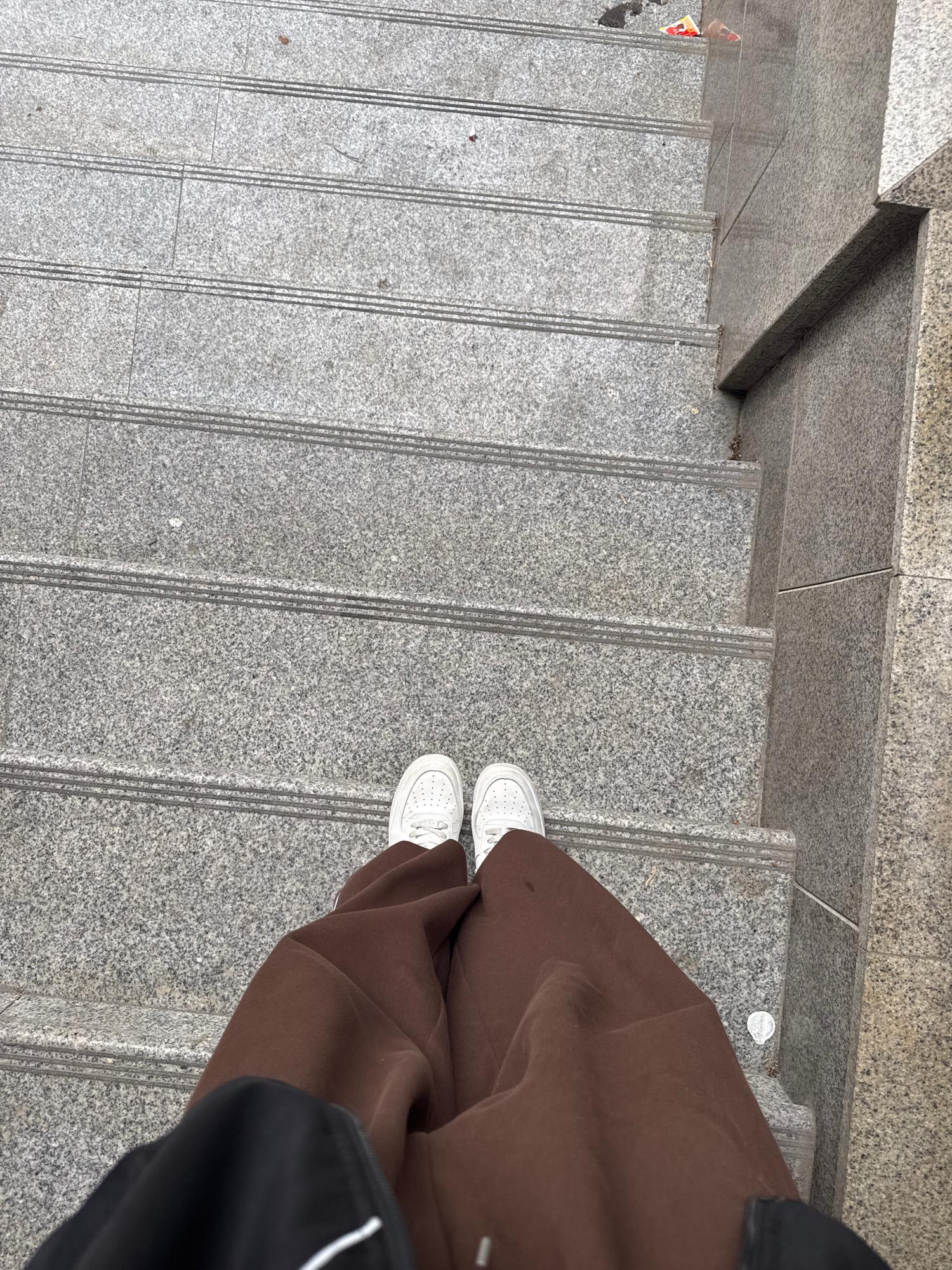 The image shows a view from above looking down onto a staircase. The staircase is made of grey, speckled stone or concrete. A person is standing on the steps, wearing white sneakers and a brown garmenβ¦read more