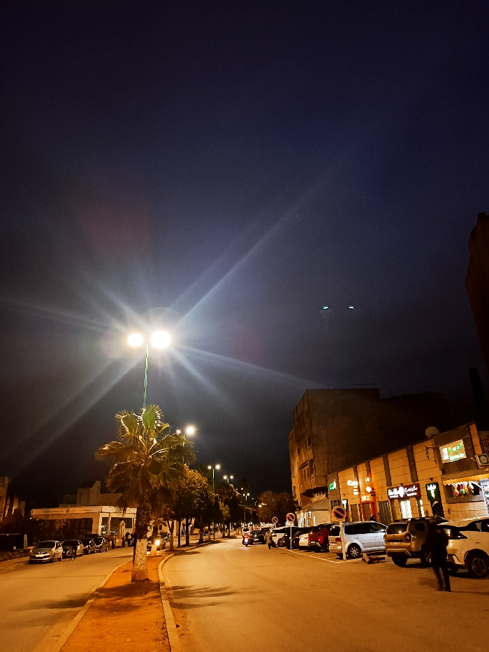 A nighttime street scene with warm artificial light illuminating buildings and parked cars. A palm tree stands beneath a bright streetlamp. The sky is a deep blue, almost black, with two small green l…read more