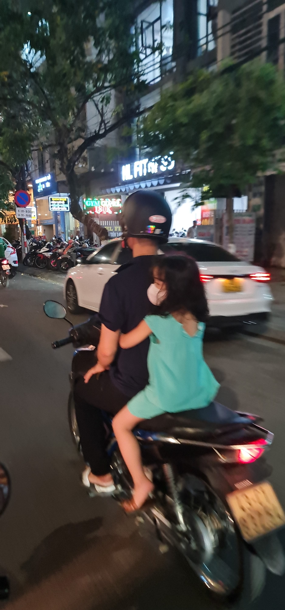Here's a detailed description of the image: **People:** * A person wearing a black helmet is riding a motorcycle. * A child in a light blue shirt is sitting in front of the rider. * Both appear…read more