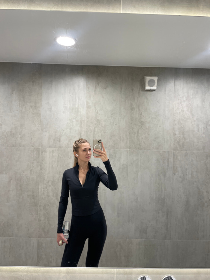 The image displays a woman taking a mirror selfie in what appears to be an indoor setting, possibly a gym changing room, bathroom, or a well-lit hallway. The image is oriented sideways, but when menta…read more