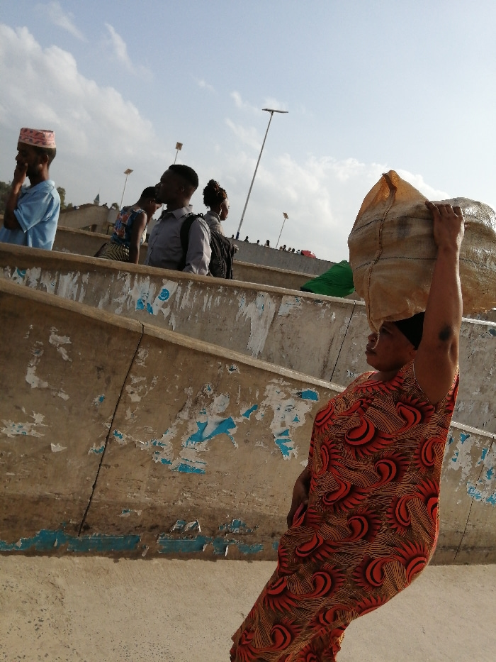 This image depicts a dynamic outdoor scene in Dar es-Salaam, Tanzania, under a bright, partly cloudy sky. In the foreground, a woman in a vivid orange and brown patterned dress and a dark head coverin…read more