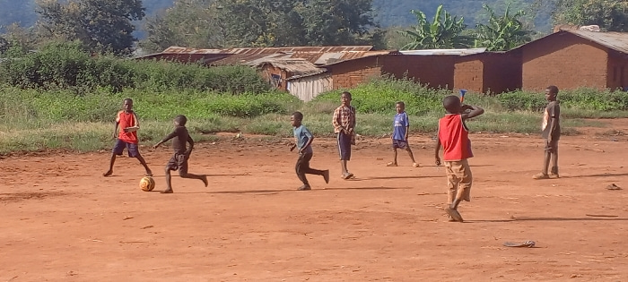 Seven young males are depicted playing and observing on an unpaved, reddish-brown dirt field in Ngalula, Democratic Republic of the Congo. The scene is brightly illuminated by natural sunlight. In th…read more