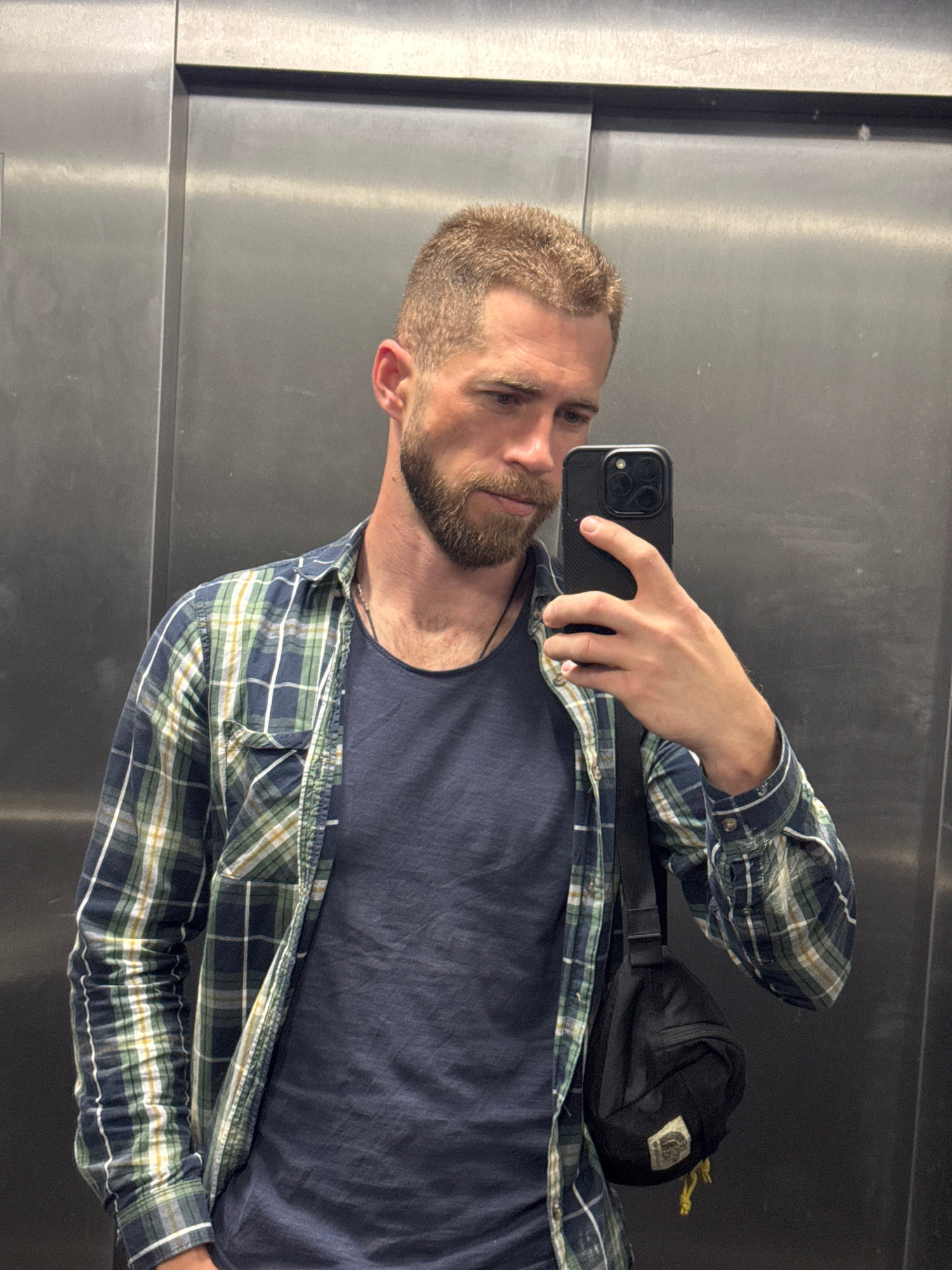 A man with short, light brown hair and a beard takes a mirror selfie in what appears to be an elevator or a space with brushed metallic walls, set in Budva, Montenegro. He is positioned facing slightl…read more