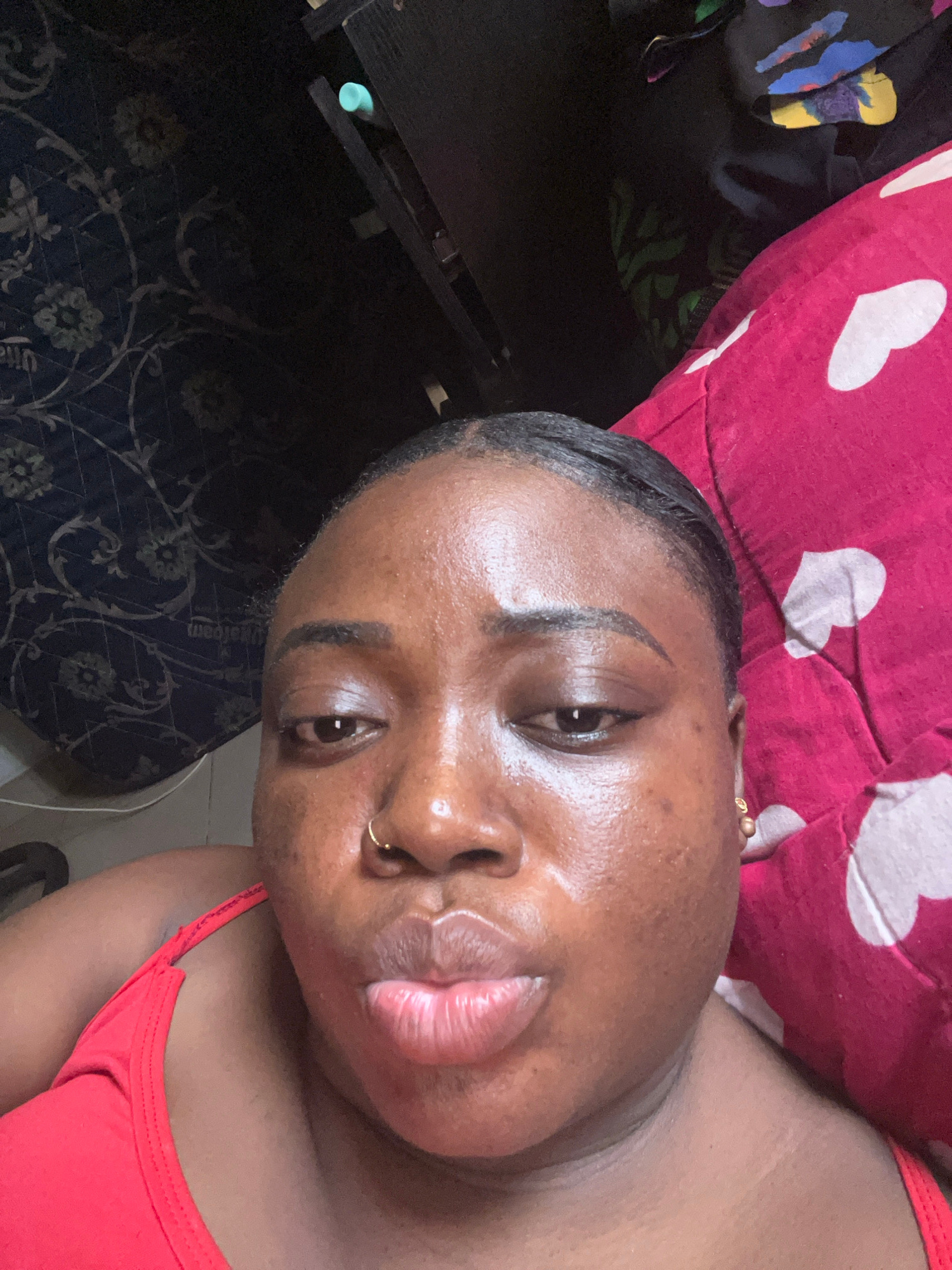 A medium shot shows a woman lying on a pillow with a red and white heart pattern. She has dark skin, dark hair styled back, and wears a gold earring and nose ring. Her expression is neutral. She wears…read more