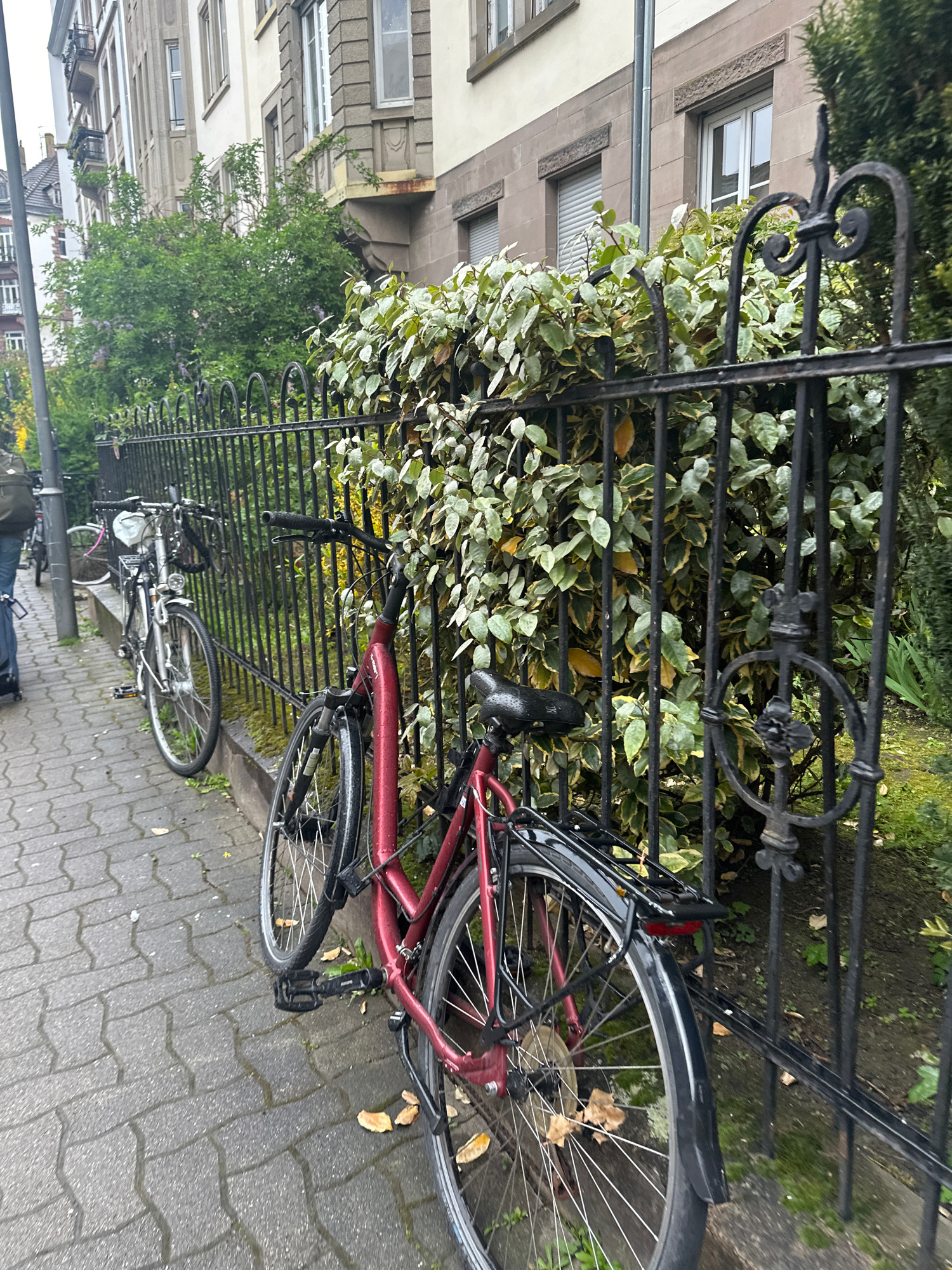 The image depicts two bicycles chained to a black iron fence in Strasbourg, France. The fence is adjacent to a building with stone facades and windows. A red bicycle is leaning against the fence, part…read more